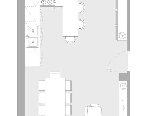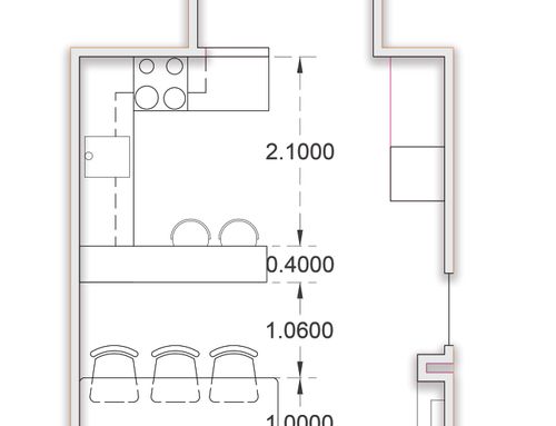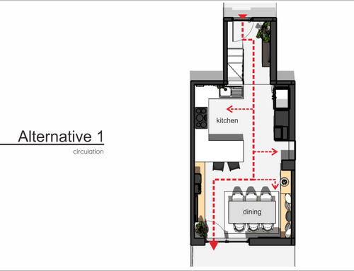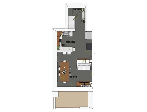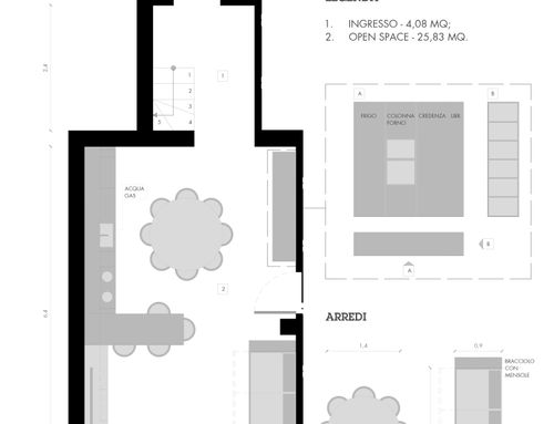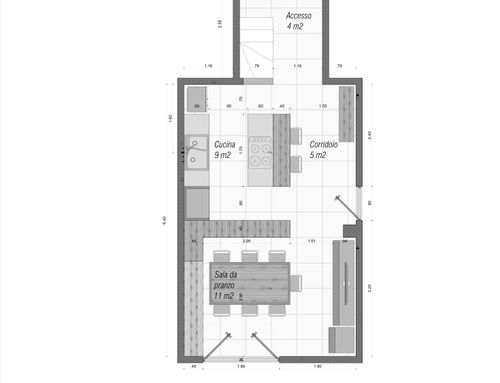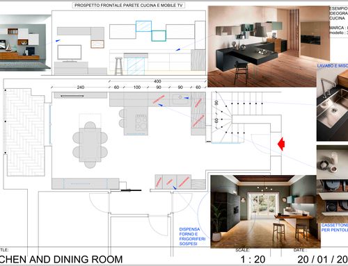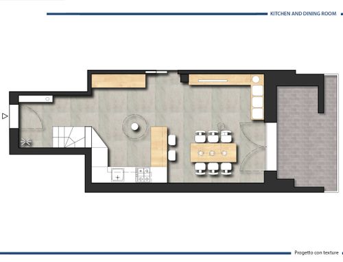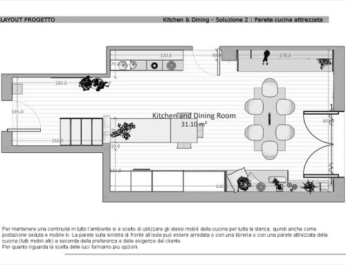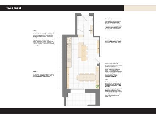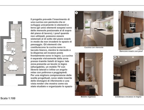 Ambiente che preveda cucina moderna, ci piacerebbe con piccola penisola snack/breakfast, bianca lucida con particolari in legno che richiamino il tavolo da pranzo in legno da 6 o 8 persone. Ci piacerebbe ricavare inoltre una piccola seduta comoda, ma allo stesso tempo di design, che sostituisse il divano (posto al piano superiore). Nell'ambiente vorremmo avere anche un posto per la TV. La stanza con vano d'ingresso all'appartamento è evidenziata in rosso nella planimetria allegata. Ci sono 2 attacchi luce in centro stanza da utilizzare.