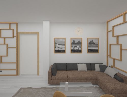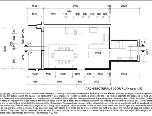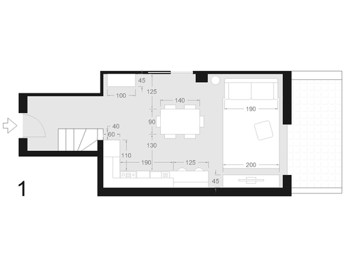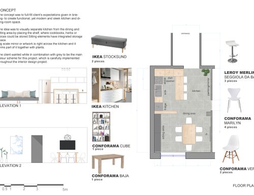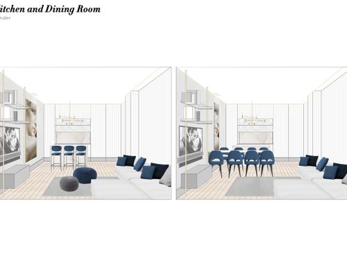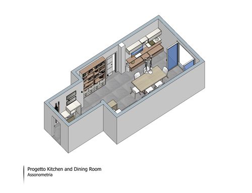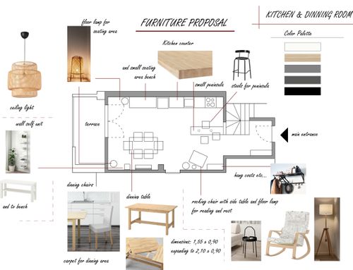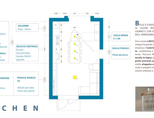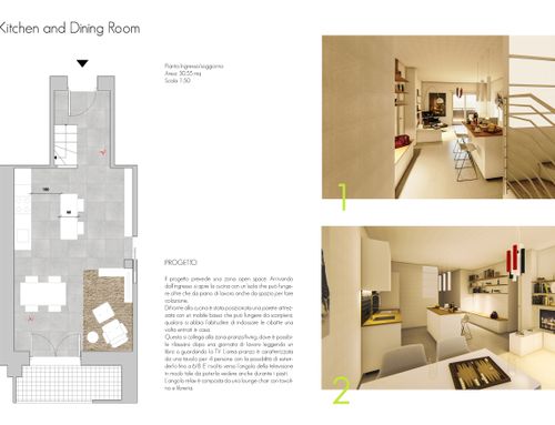 Kitchen and dining zone; modern white style with wooden details and, if it si possible, a small peninsula for snack/breakfast. In dining zone there will be a wooden table for 6 or 8 persons and a small but comfortable seat (the sofa is upstairs). A led TV is needed. Two points for lights are placed in the middle of the room.
