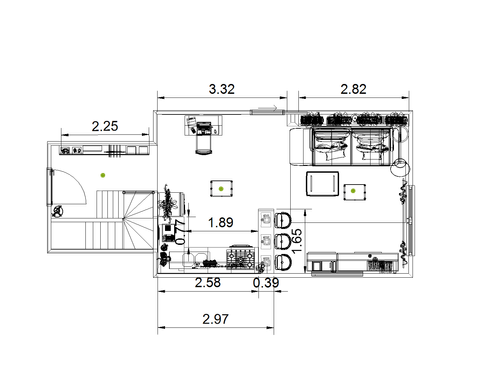 En el comedor habrá una mesa de madera para 6 u 8 personas y y un asiento pequeño pero cómodo (el sofá se encuentra arriba). Una TV led es necesaria. Dos puntos para las luces están colocados en el centro de la habitación.