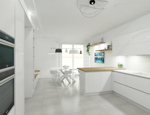 Cocina y comedor; estilo blanco moderno con detalles de madera y, de ser posible, una pequeña península para merienda/desayuno.