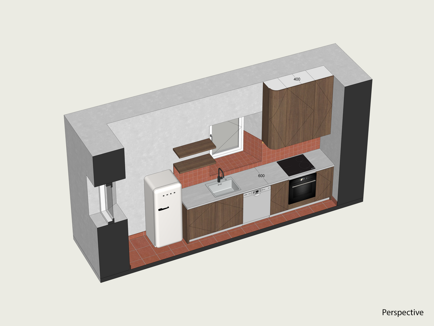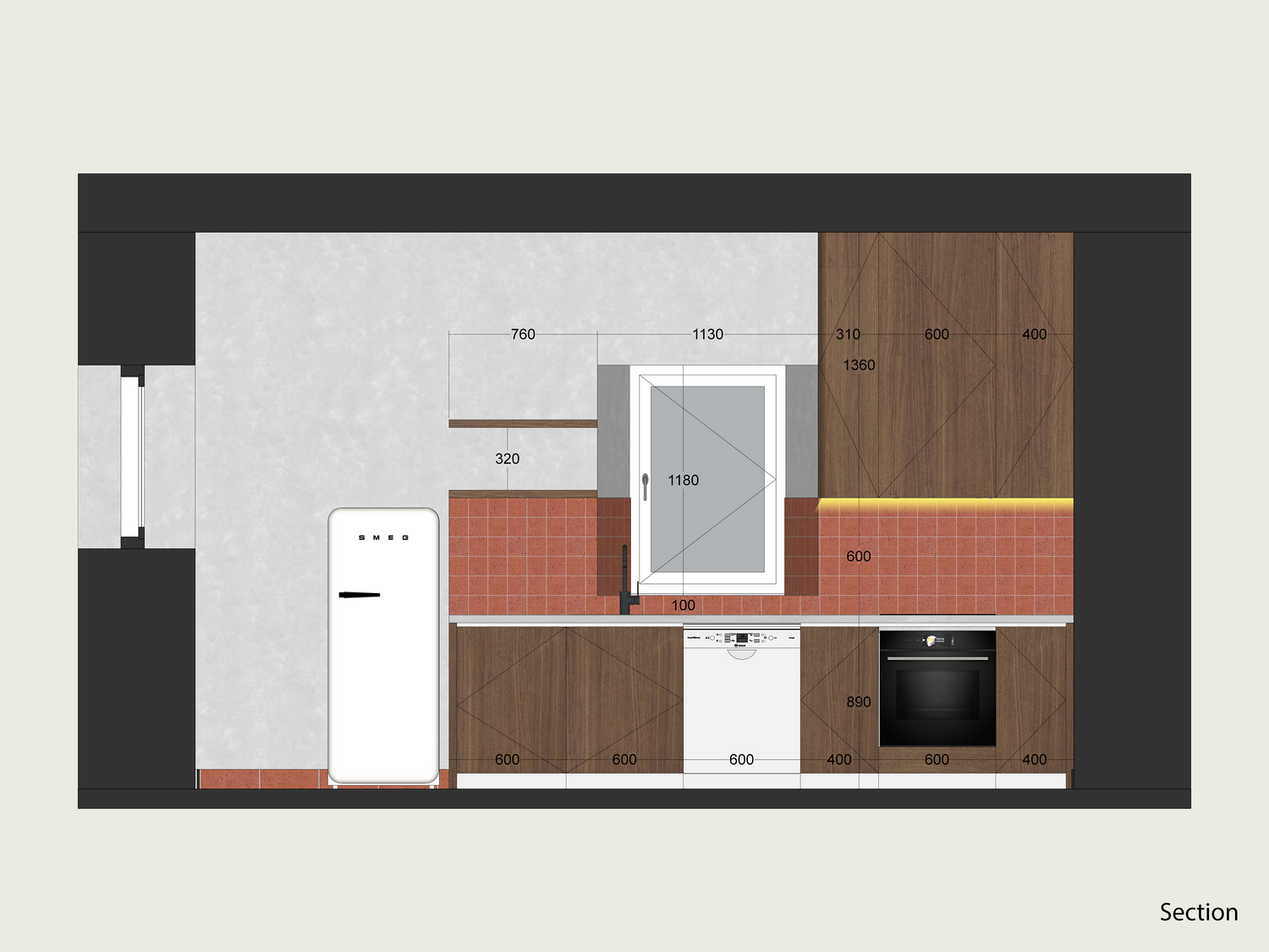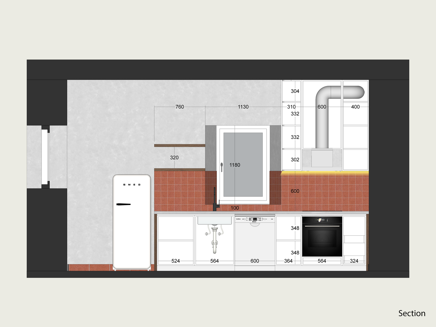 while the induction cooktop and built-in oven are from Bosch, and the cooker hood is from Elica.
