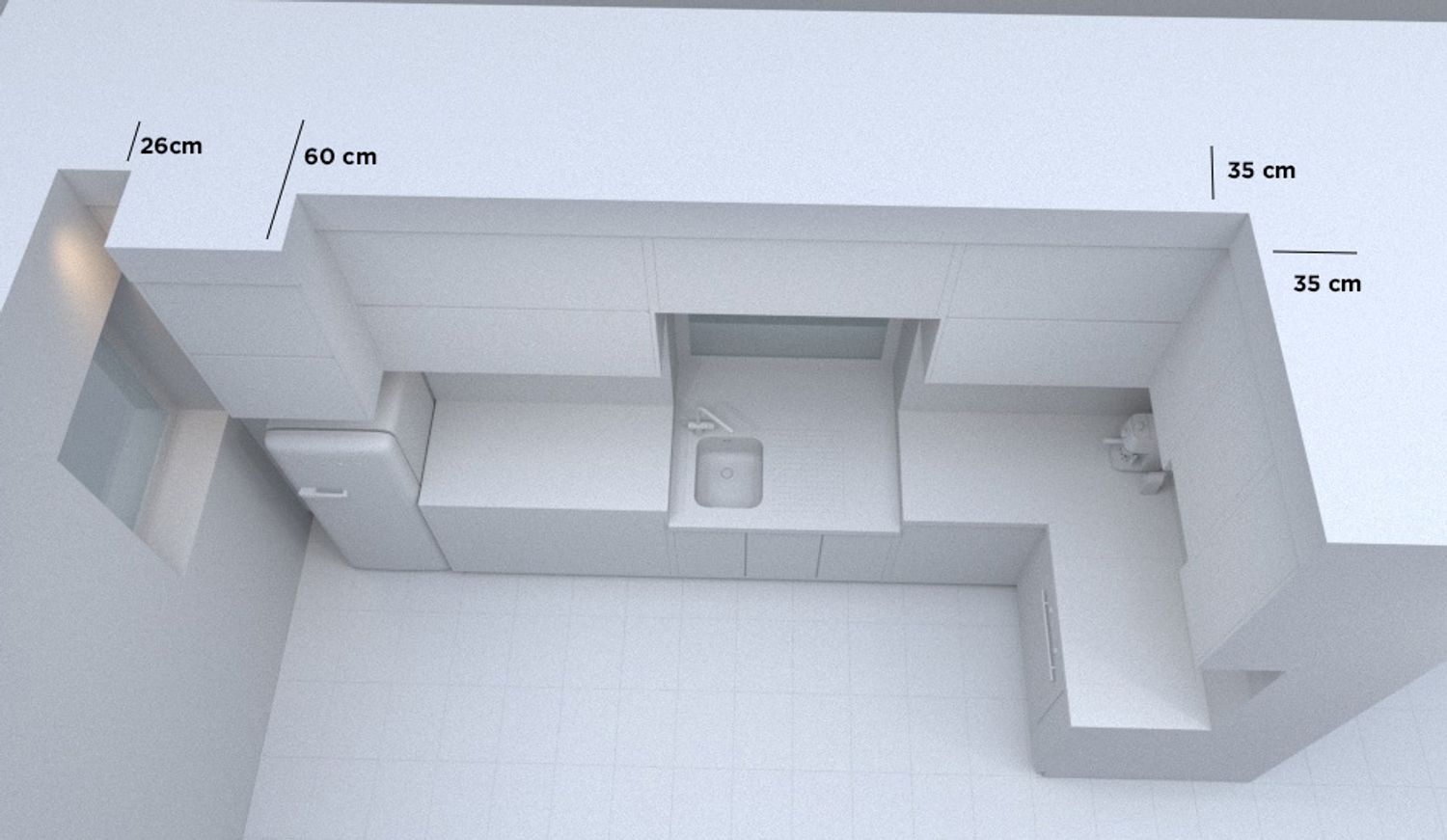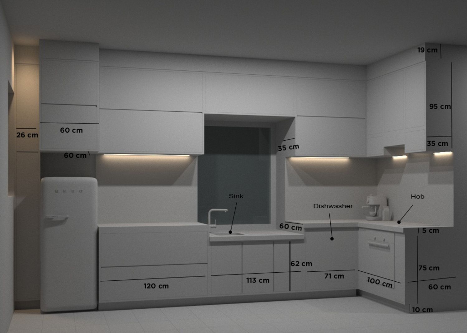 The refrigerator is placed at a distance from the side window and in the space between the refrigerator and the window, a showcase with a shallow depth to use the space and also to allow the side window to be opened.