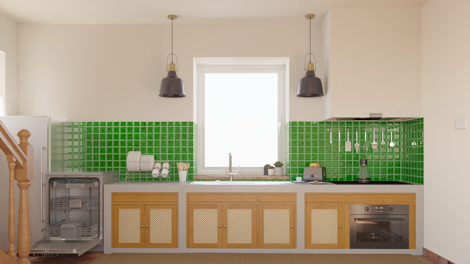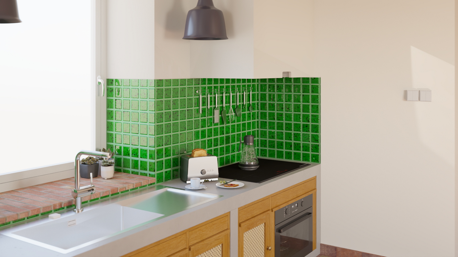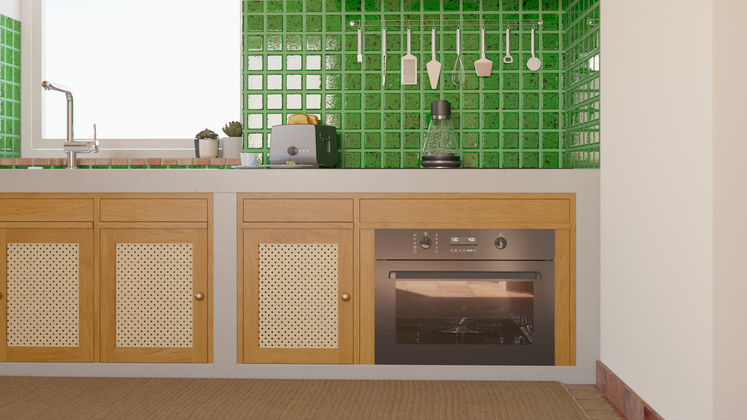 This project consists of a linear masonry kitchen. The layout integrates the client’s existing freestanding appliances and responds to the low existing window sill by setting a reduced countertop height beneath the window, ensuring full operability of the window and sink tap.