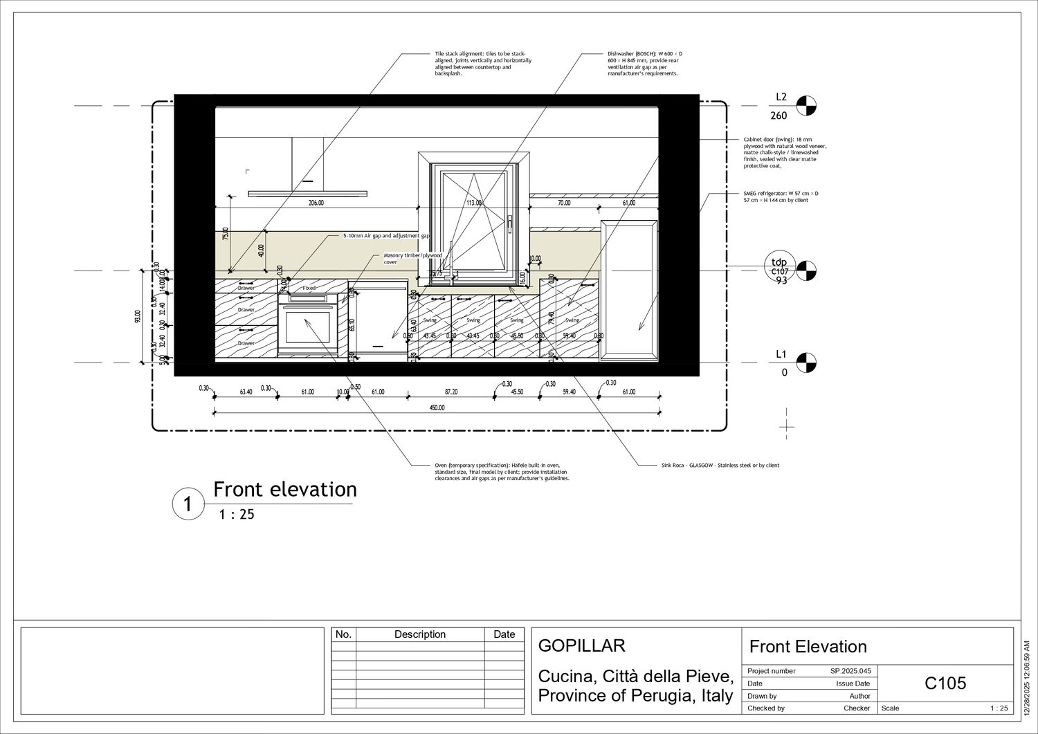 The linear layout optimises the flow between storage, preparation, and cooking, with the refrigerator positioned on the right to maintain a clear functional sequence and preserve natural light from the window, while the sink, dishwasher, and hob on the left ensure efficient services and a more generous working area.