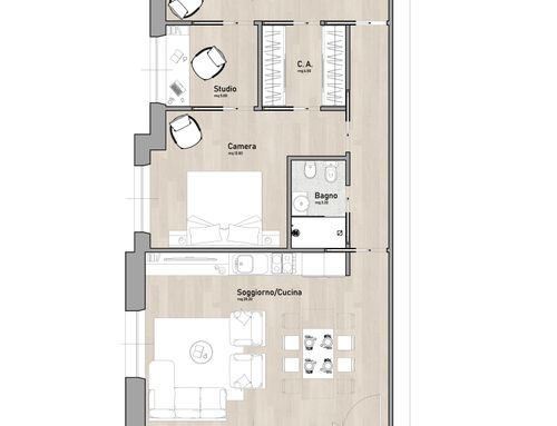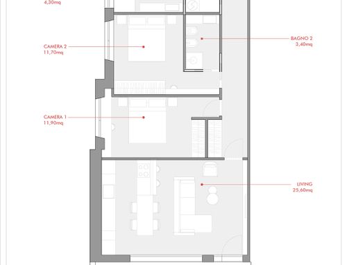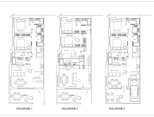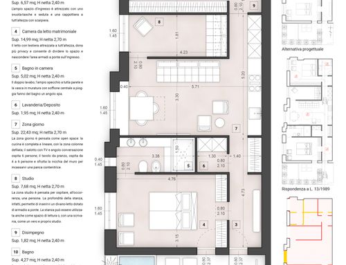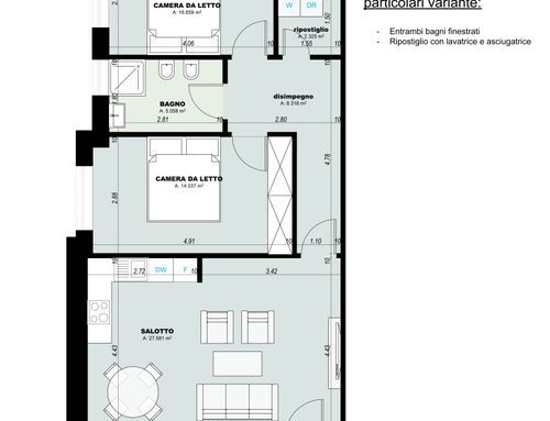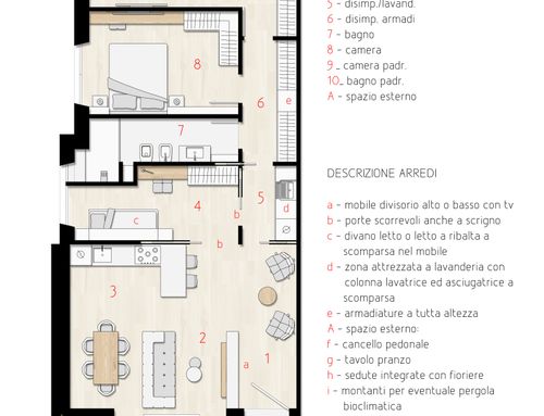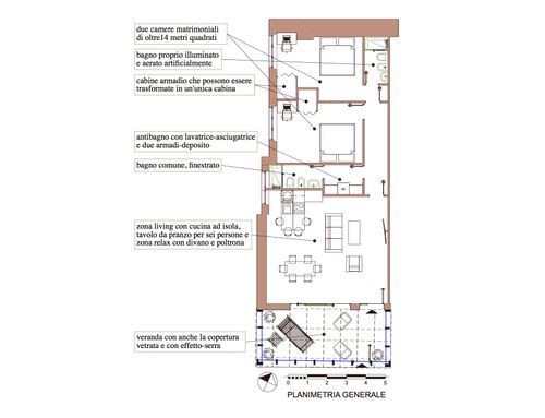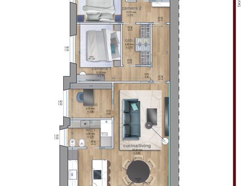 Le due camere matrimoniali potranno avere una cabina armadio in comune con doppio accesso recuperando lo spazio interno altrimenti destinato a armadi/guardaroba.