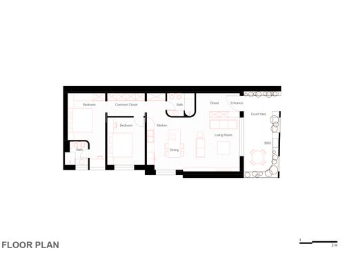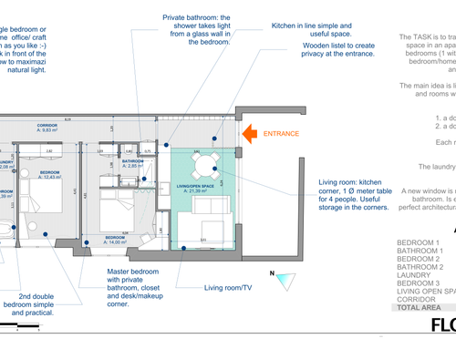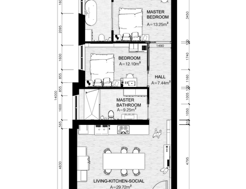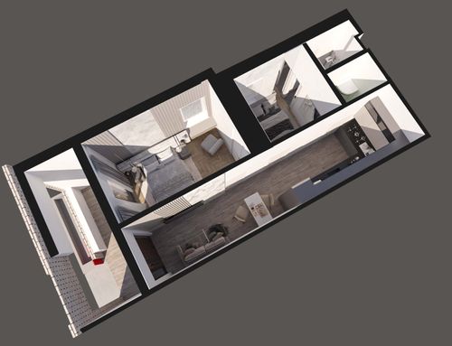 A commercial space recently converted for residential use requires internal and external redesign. The request is to create: 2 double bedrooms, one with an ensuite bathroom, a room to be used as a study or small bedroom (optional), a master bathroom, and a dining/living area.