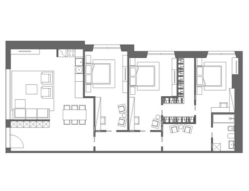 The two double bedrooms may share a walk-in closet with dual access, reclaiming the interior space that would otherwise be used for wardrobes. Pocket doors are preferred over swinging doors. An additional window can be opened on the windowed side.