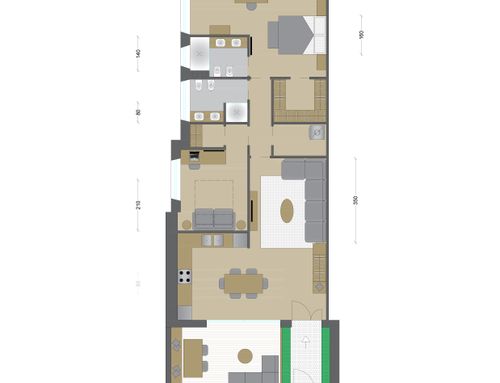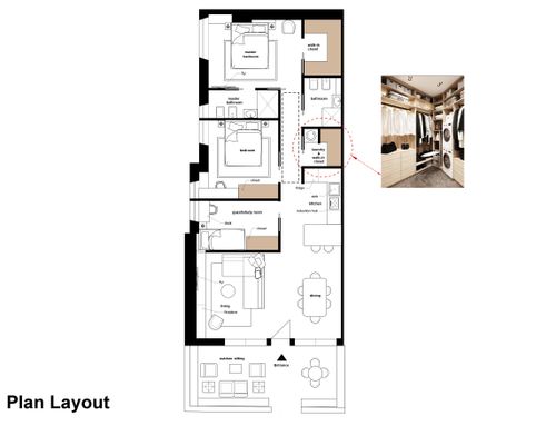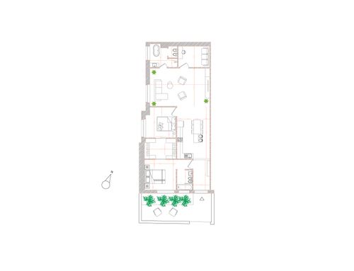 Las dos habitaciones dobles pueden compartir un vestidor con acceso doble, recuperando el espacio interior que de lo contrario se destinaría a armarios. Se prefieren puertas correderas en lugar de puertas batientes. Se puede abrir una ventana adicional en el lado con ventanas.