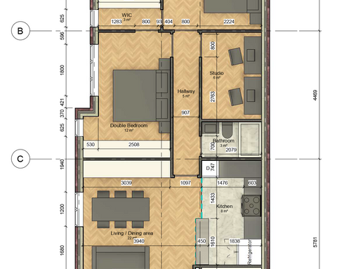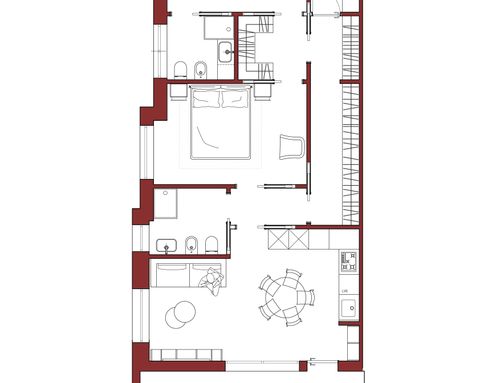 Un local comercial recientemente convertido para uso residencial requiere una reconfiguración interna y externa. Se solicita crear: 2 habitaciones dobles, una con baño en suite, una habitación destinada a estudio o habitación pequeña (opcional), un baño principal y una zona de comedor/sala de estar.