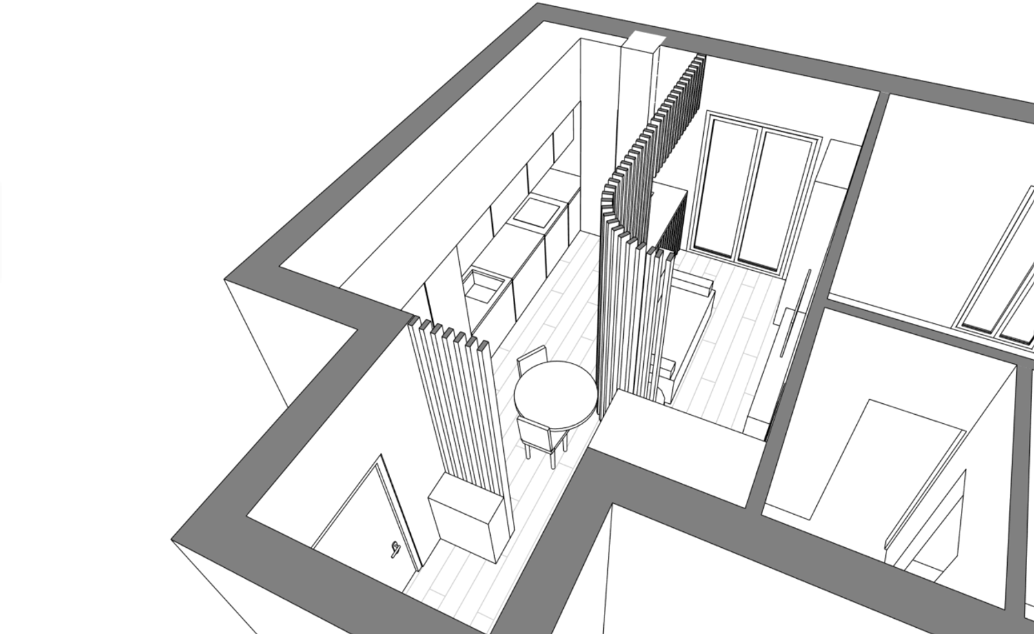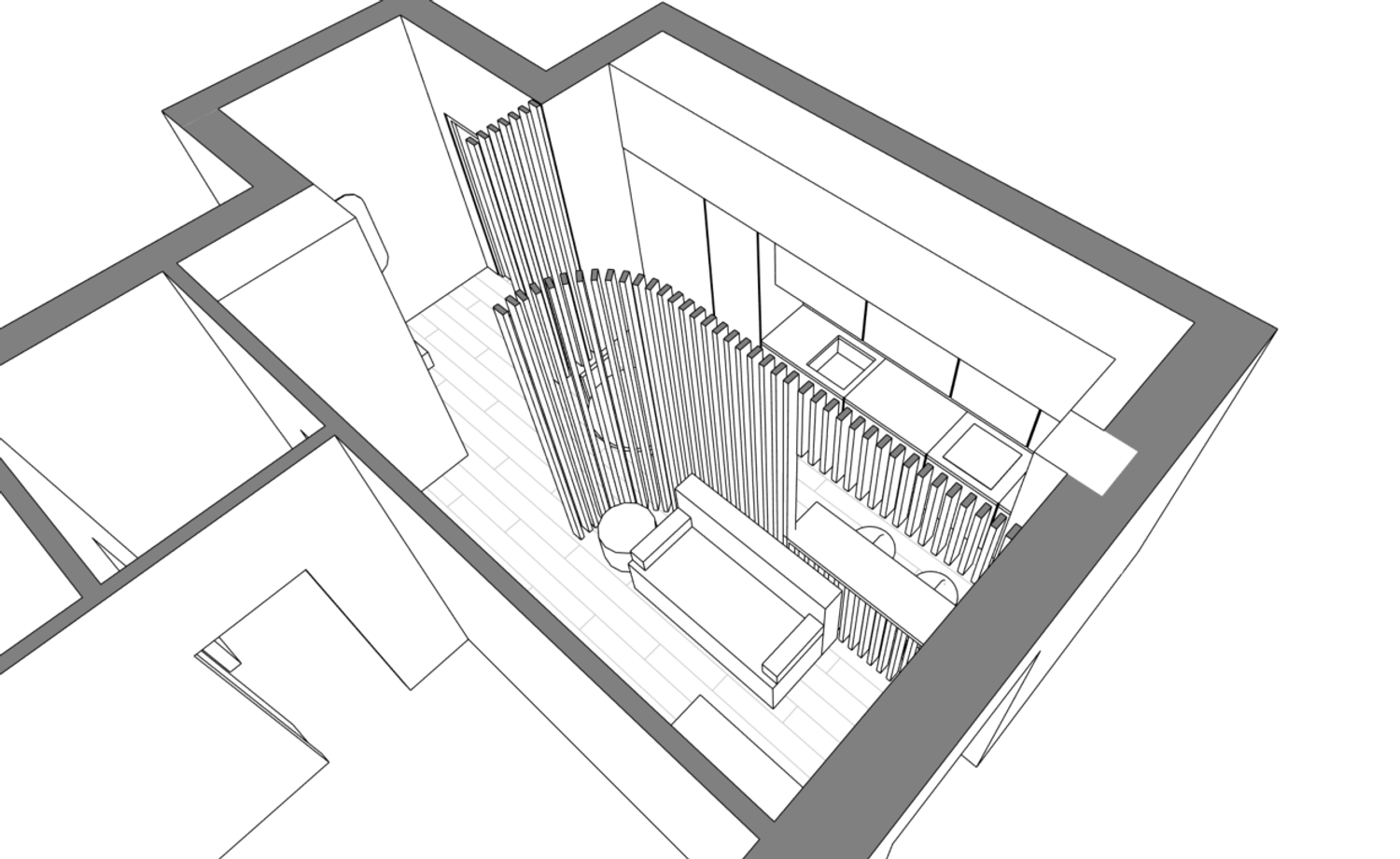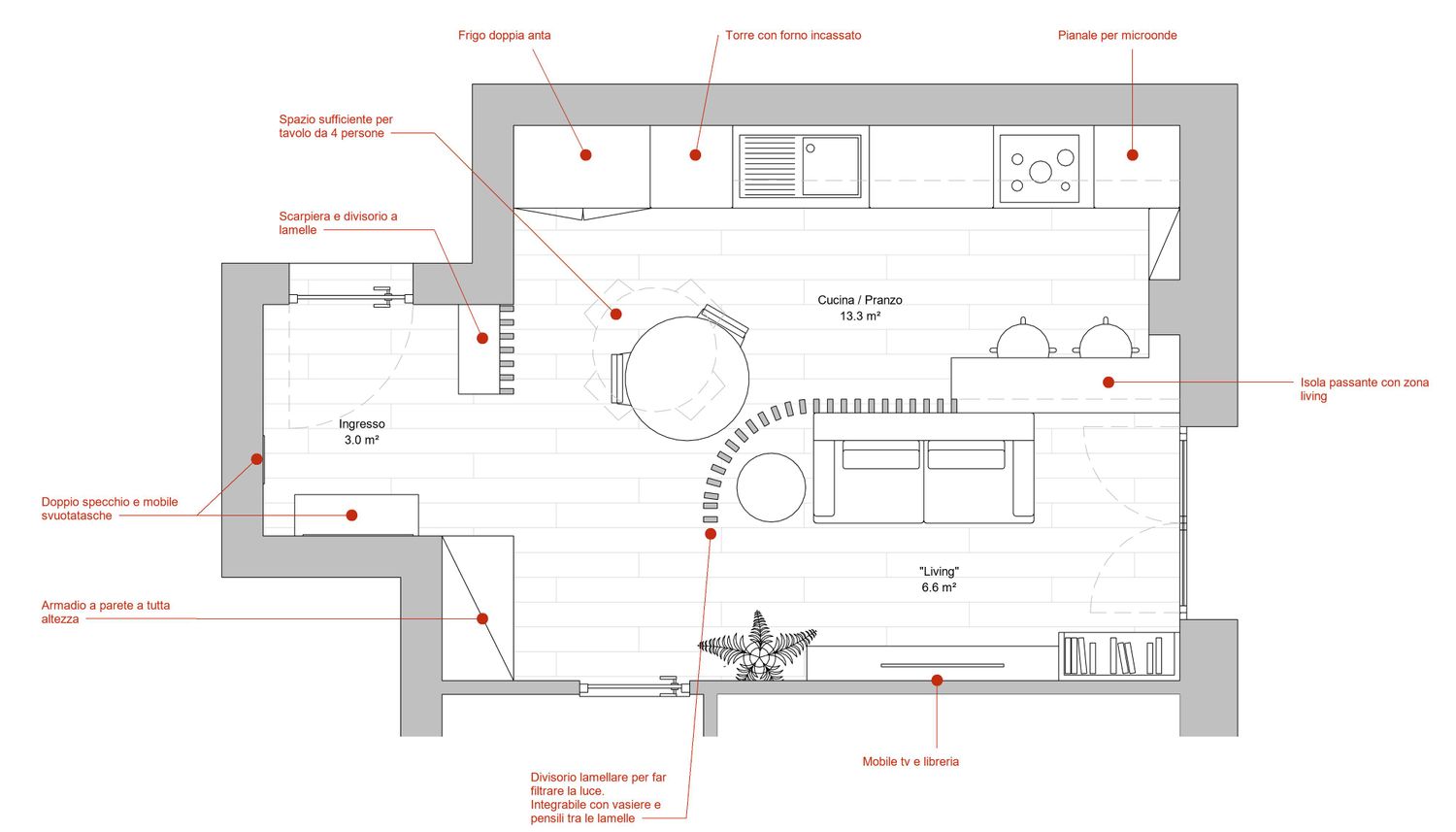 Dato lo spazio molto ristretto a disposizione, l'idea è stata quella di rendere interessante l'ambiente con una partizione che dividesse le due aree ma, al tempo stesso, non tagliasse nettamente lo spazio in due.