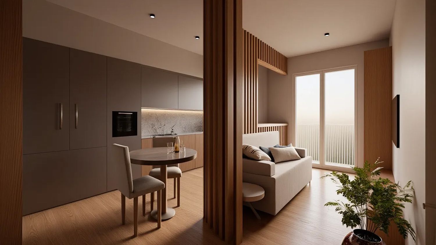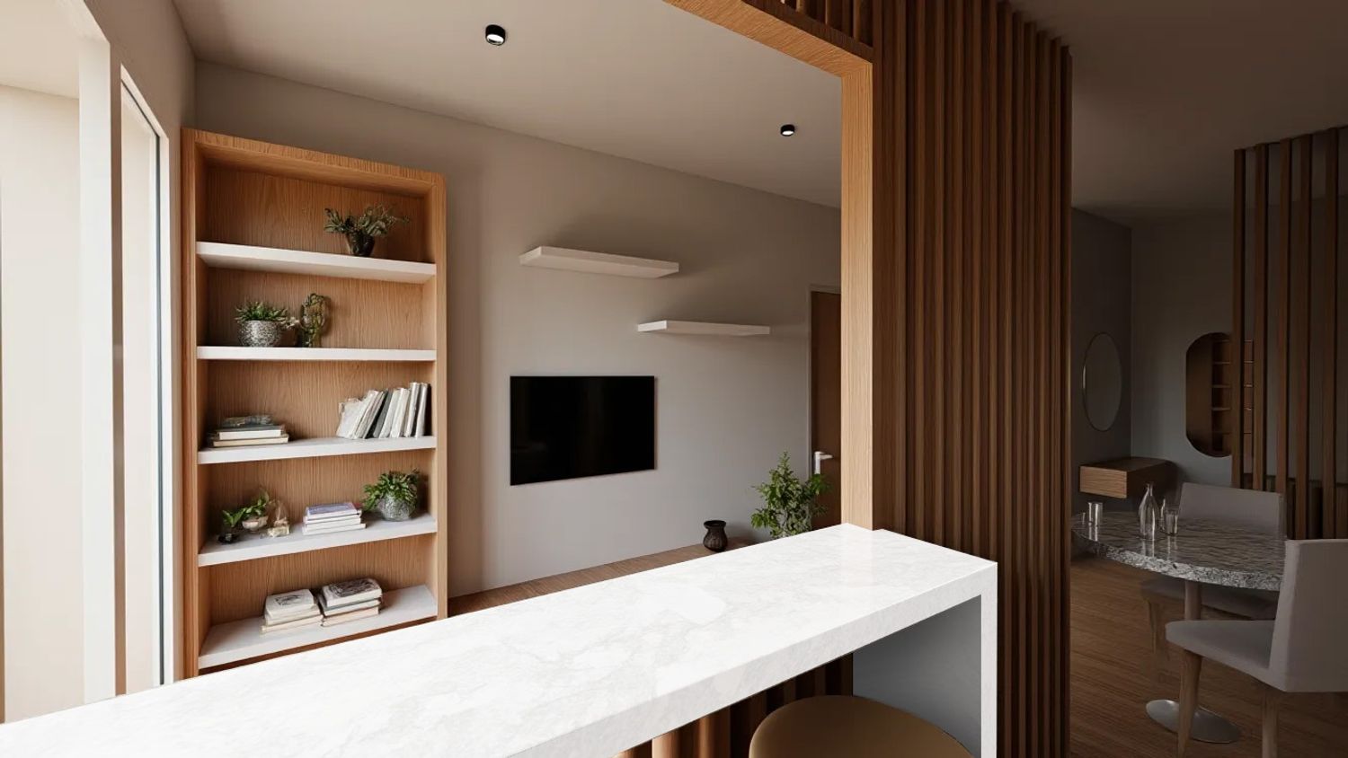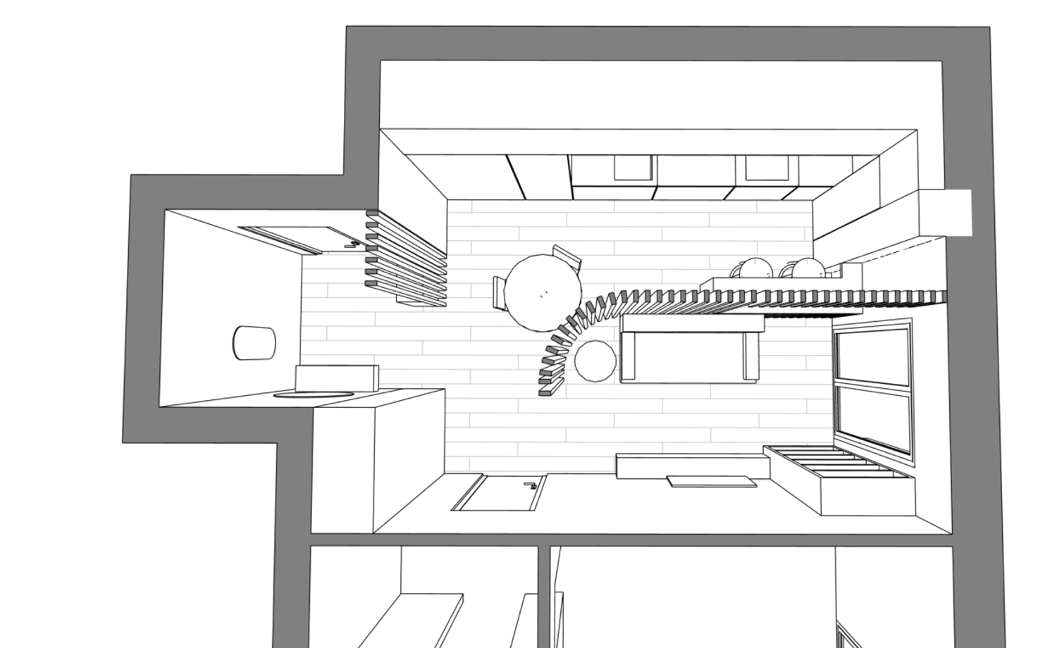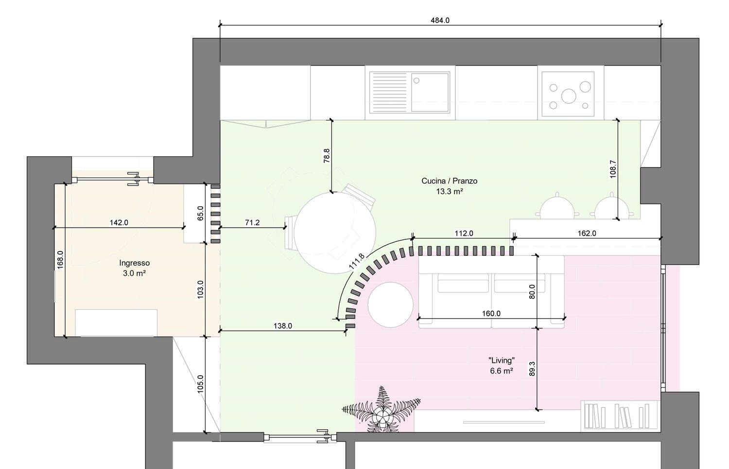 Dato lo spazio molto ristretto a disposizione, l'idea è stata quella di rendere interessante l'ambiente con una partizione che dividesse le due aree ma, al tempo stesso, non tagliasse nettamente lo spazio in due.