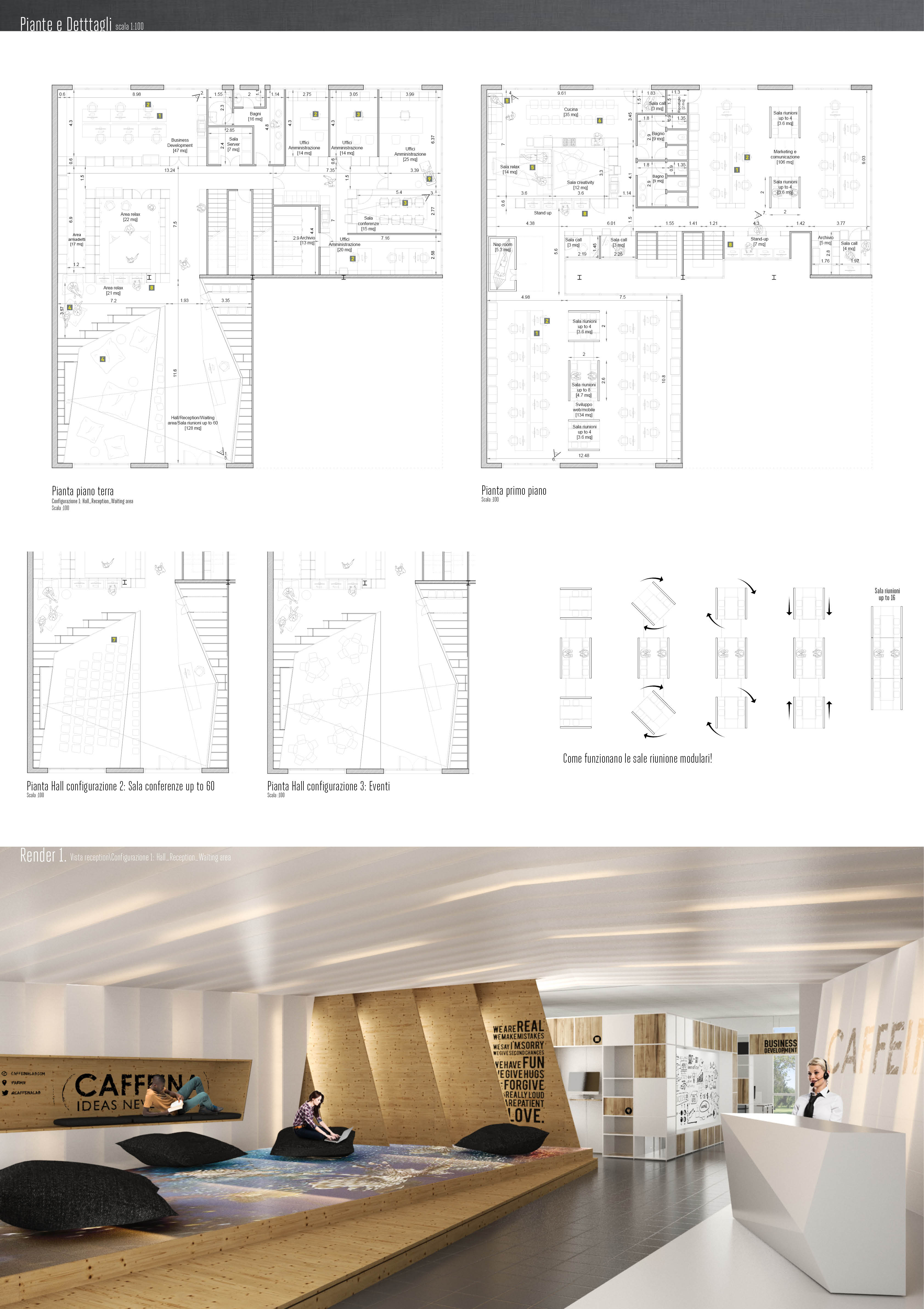 - sala riunioni plenaria: proiettore a soffitto, sistema audio (casse + microfono), pareti mobili per separarla eventualmente dalle altre aree aziendali.