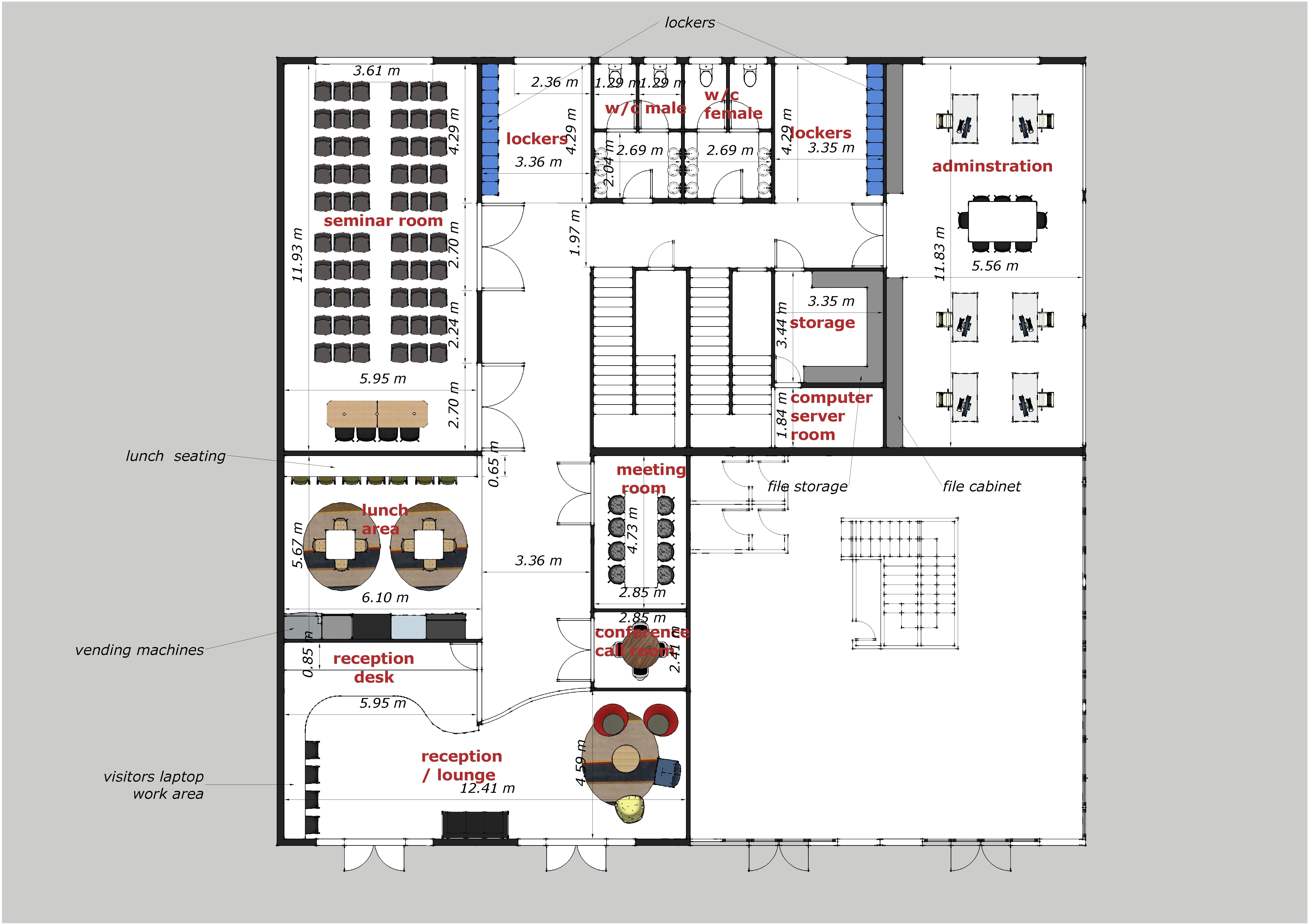 - Finally, we would require a small storage room (10-15 square meters), if possible adjacent to the admin department. We would also potentially like to have a comms room – the two functions may share the same space.