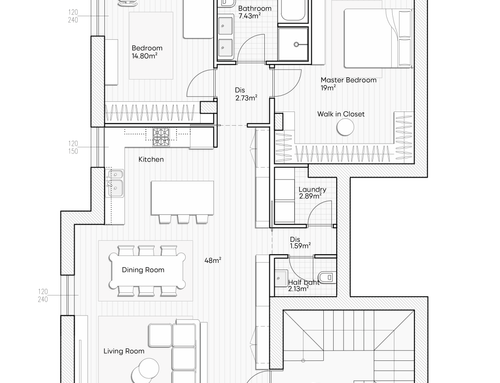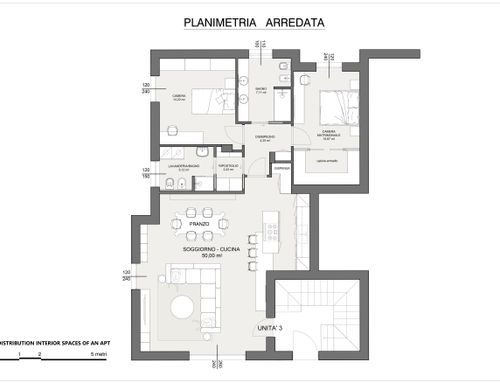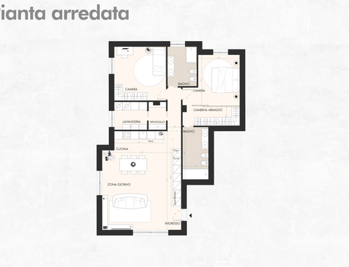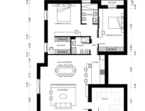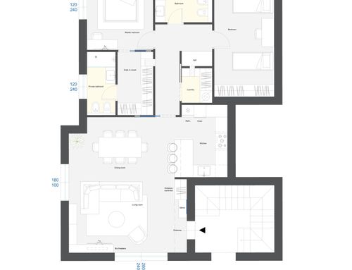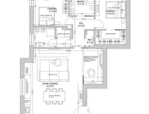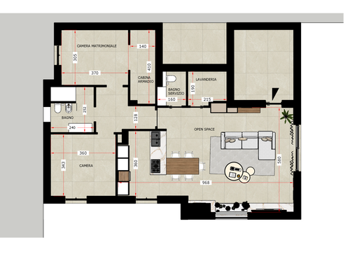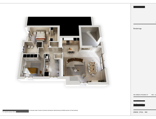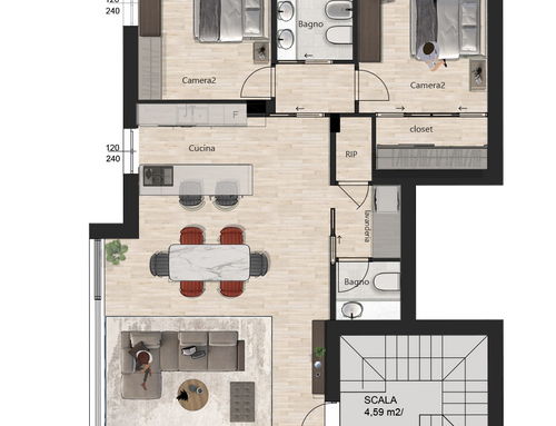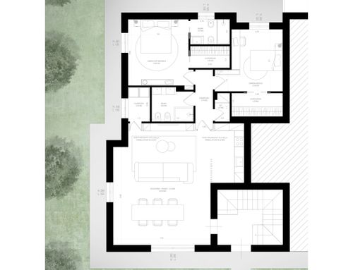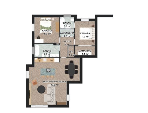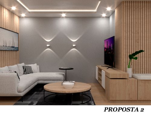 La distribución interior del apartamento (excluyendo ventanas) es ajustable; se aceptan nuevas ideas y ajustes. Estilo moderno básico. La cocina preferiblemente en estilo rústico y el suelo en parquet mate claro o resina clara. Detalles rústicos o industriales a discreción del arquitecto. Los colores son blancos o generalmente claros, sin contrastes fuertes.