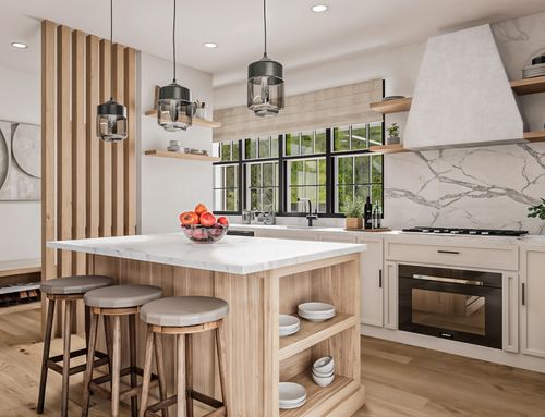 Basicq modern style. Kitchen preferably in a country style and flooring in either matte light parquet or light resin. Country or industrial details at the architect's discretion. The colors are white or generally light, without strong contrasts.
