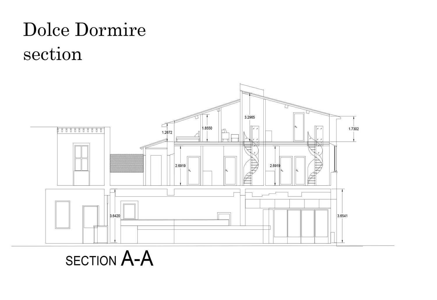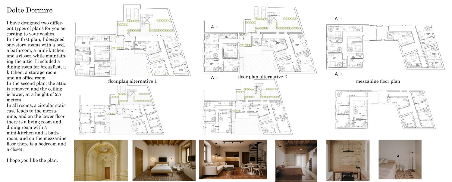 In the first plan, I designed one-story rooms with a bed, a bathroom, a mini-kitchen, and a closet, while maintaining the attic. I included a dining room for breakfast, a kitchen, a storage room, and an office room.