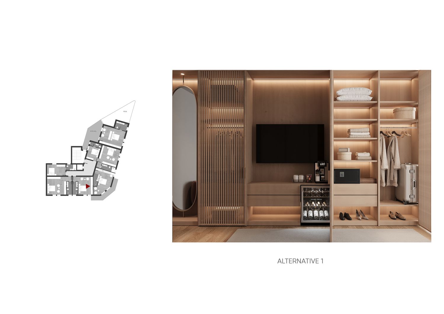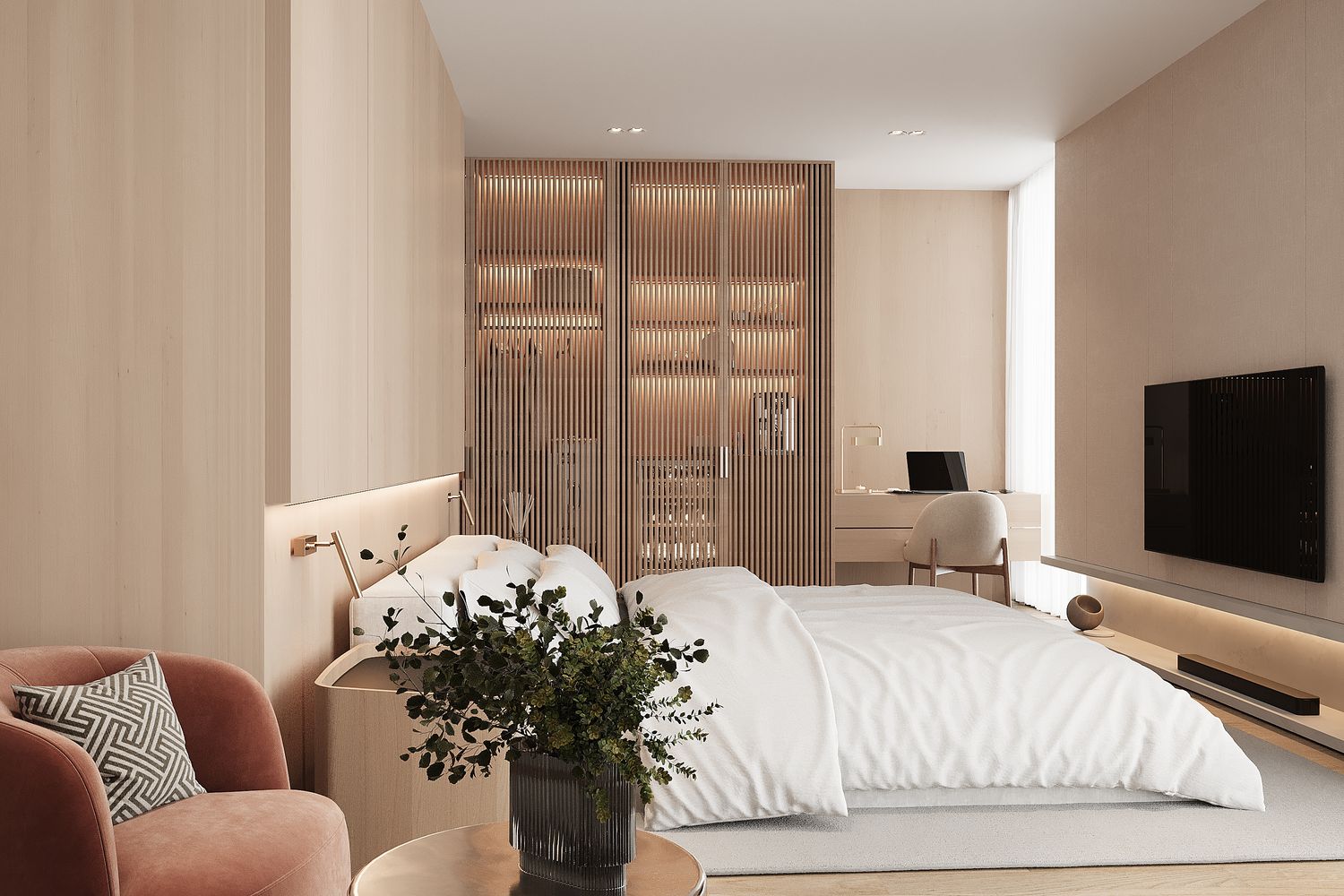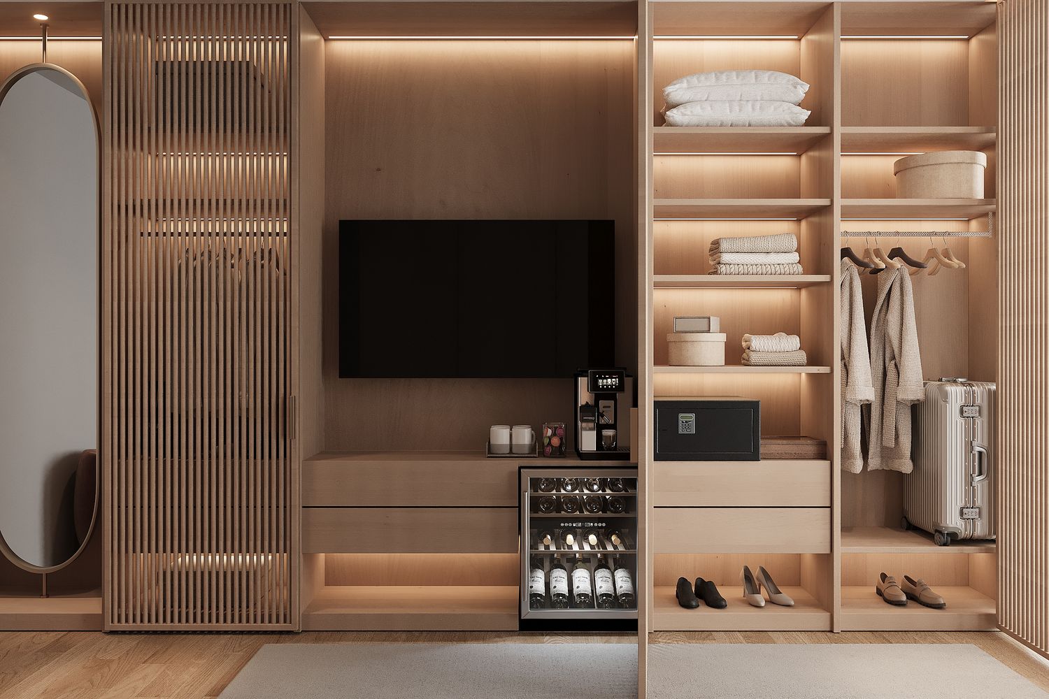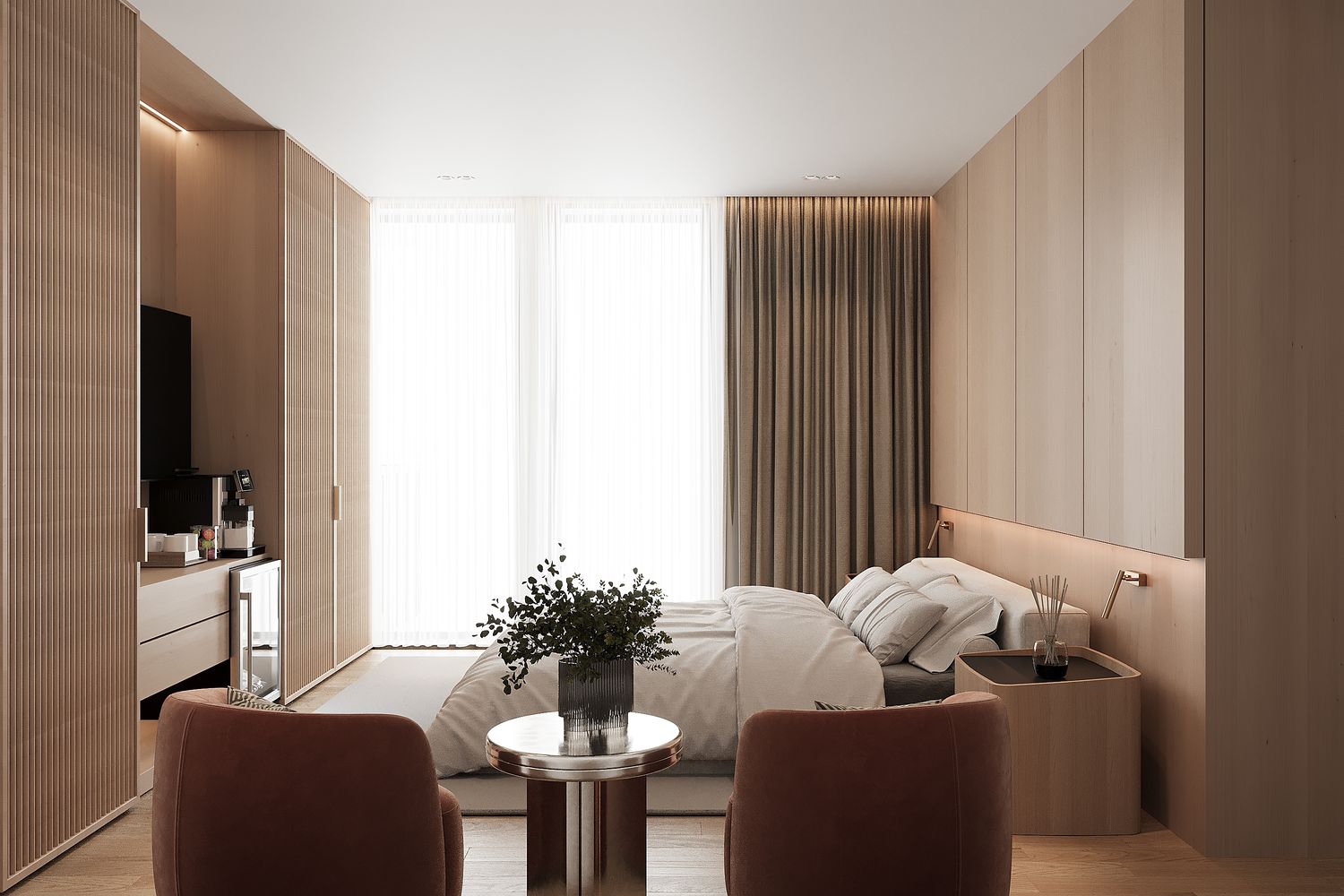 The use of champagne-toned metallic finishes combined with oak wood enhances the space with a refined, luxurious, yet friendly character.
