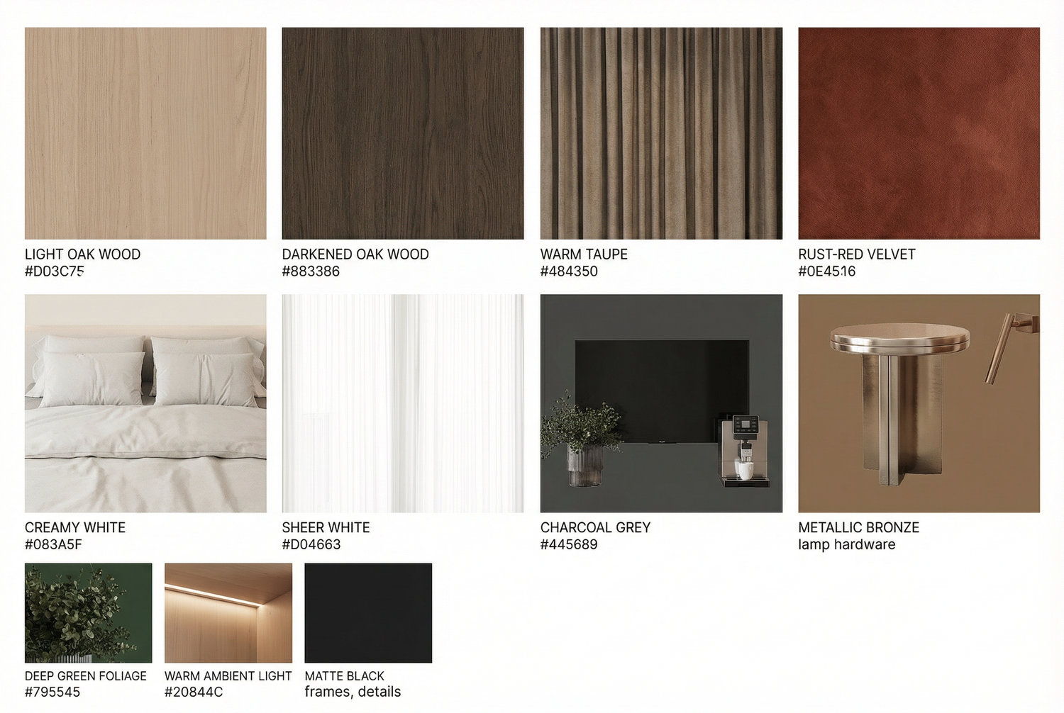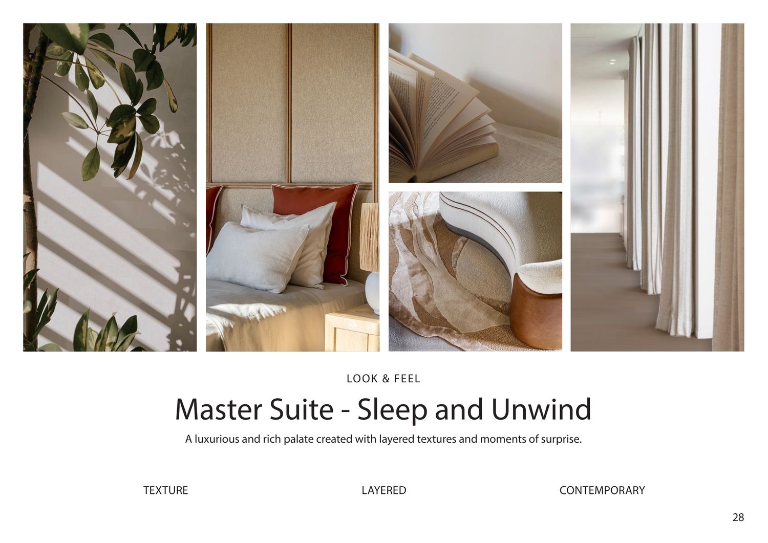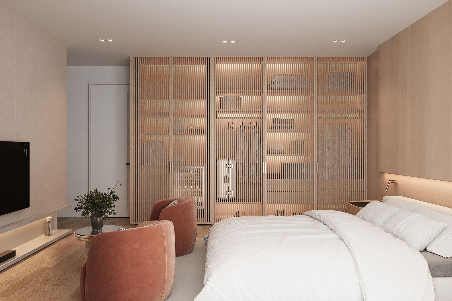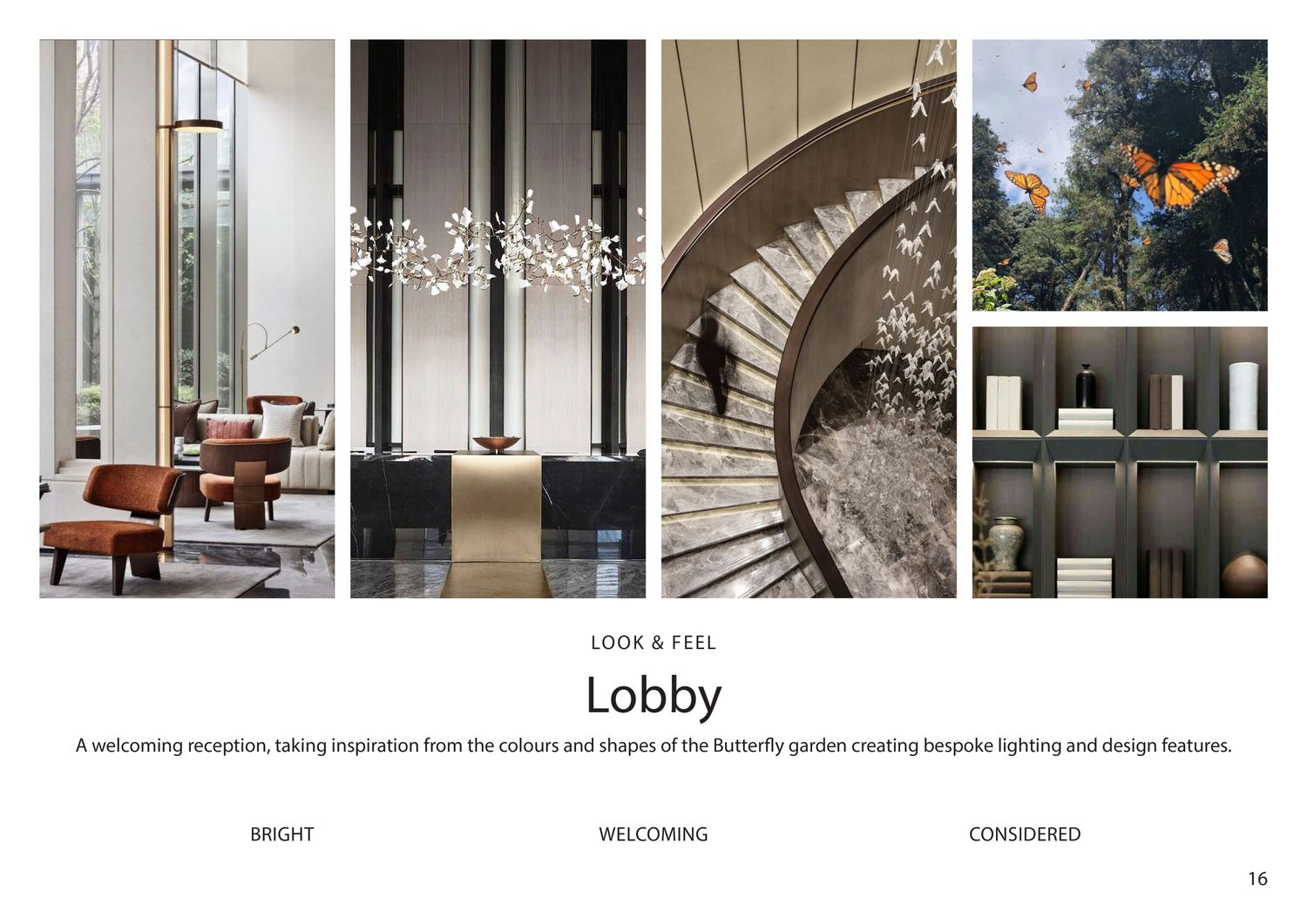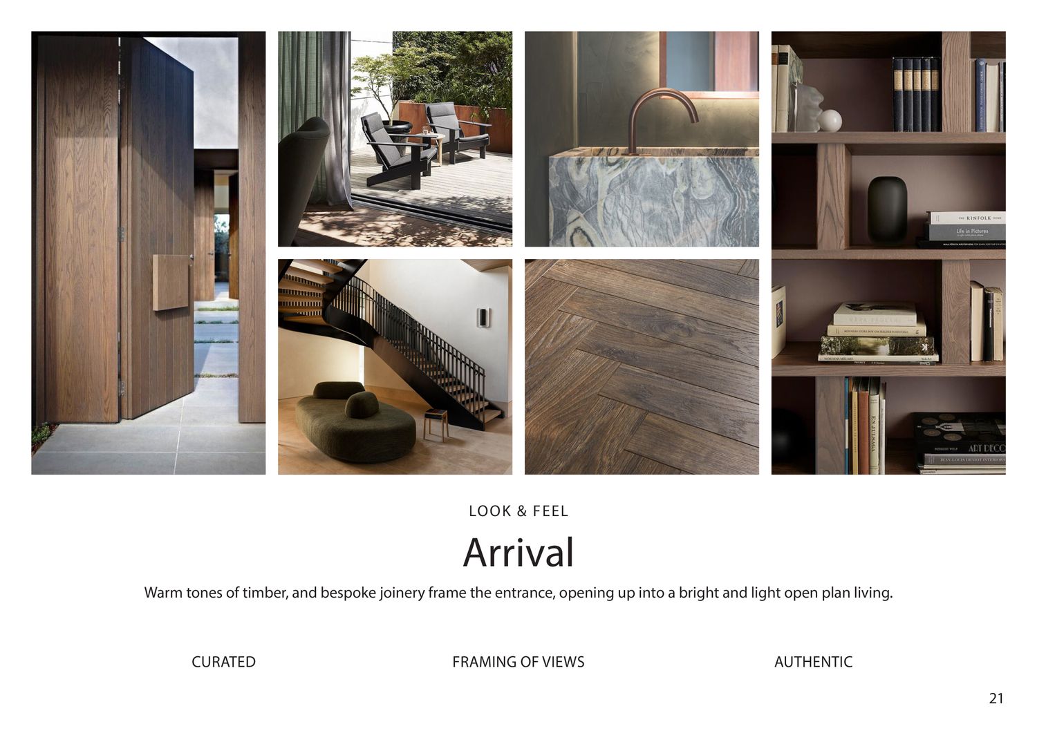 The use of champagne-toned metallic finishes combined with oak wood enhances the space with a refined, luxurious, yet friendly character.
