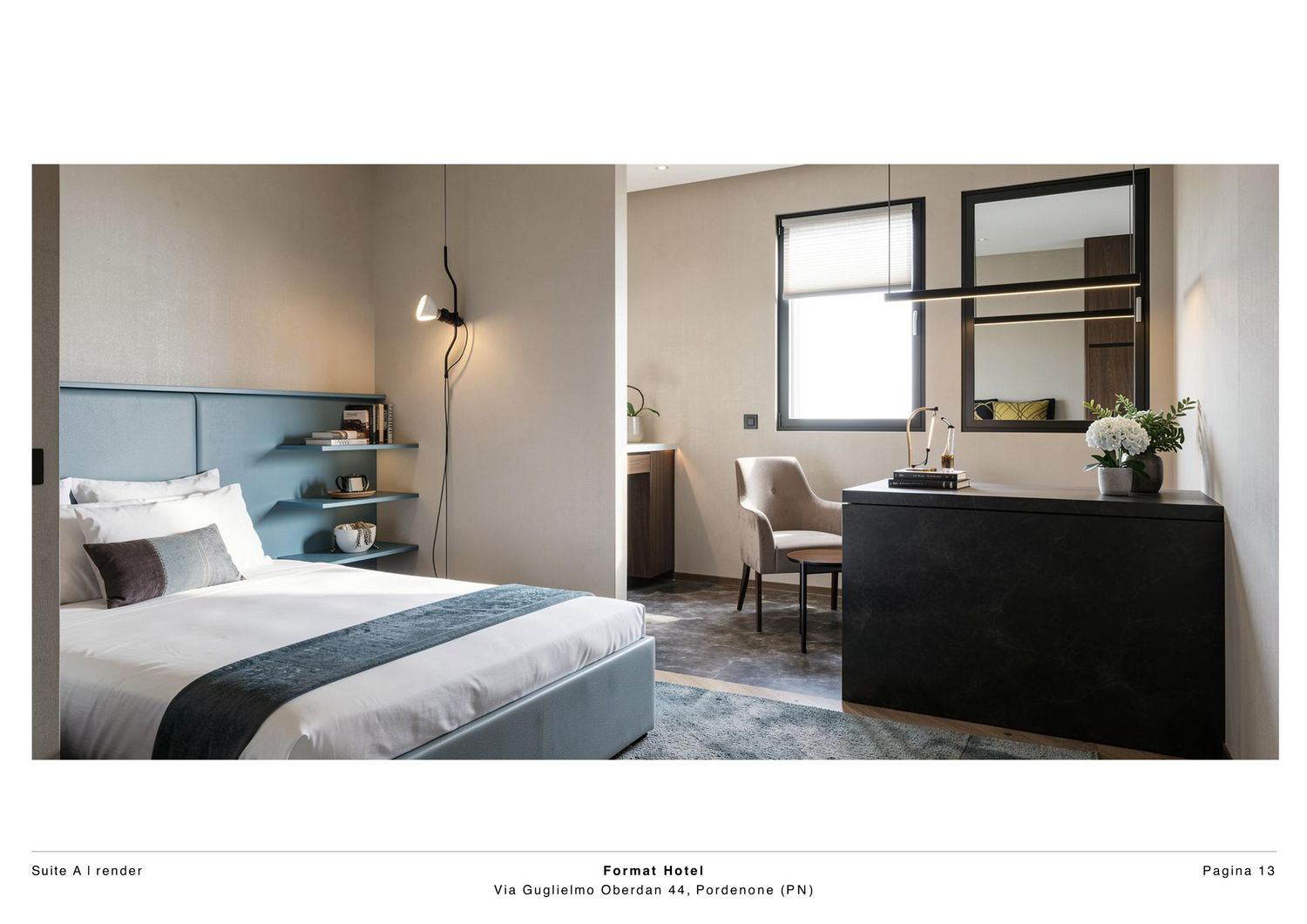 La Suite A del Format Hotel rappresenta un esempio di design alberghiero contemporaneo, dove funzionalitĂ , estetica e comfort si fondono in uno spazio compatto. La planimetria aperta, lo stile minimalista, le finiture durevoli e gli arredi di design creano un ambiente accogliente e moderno.