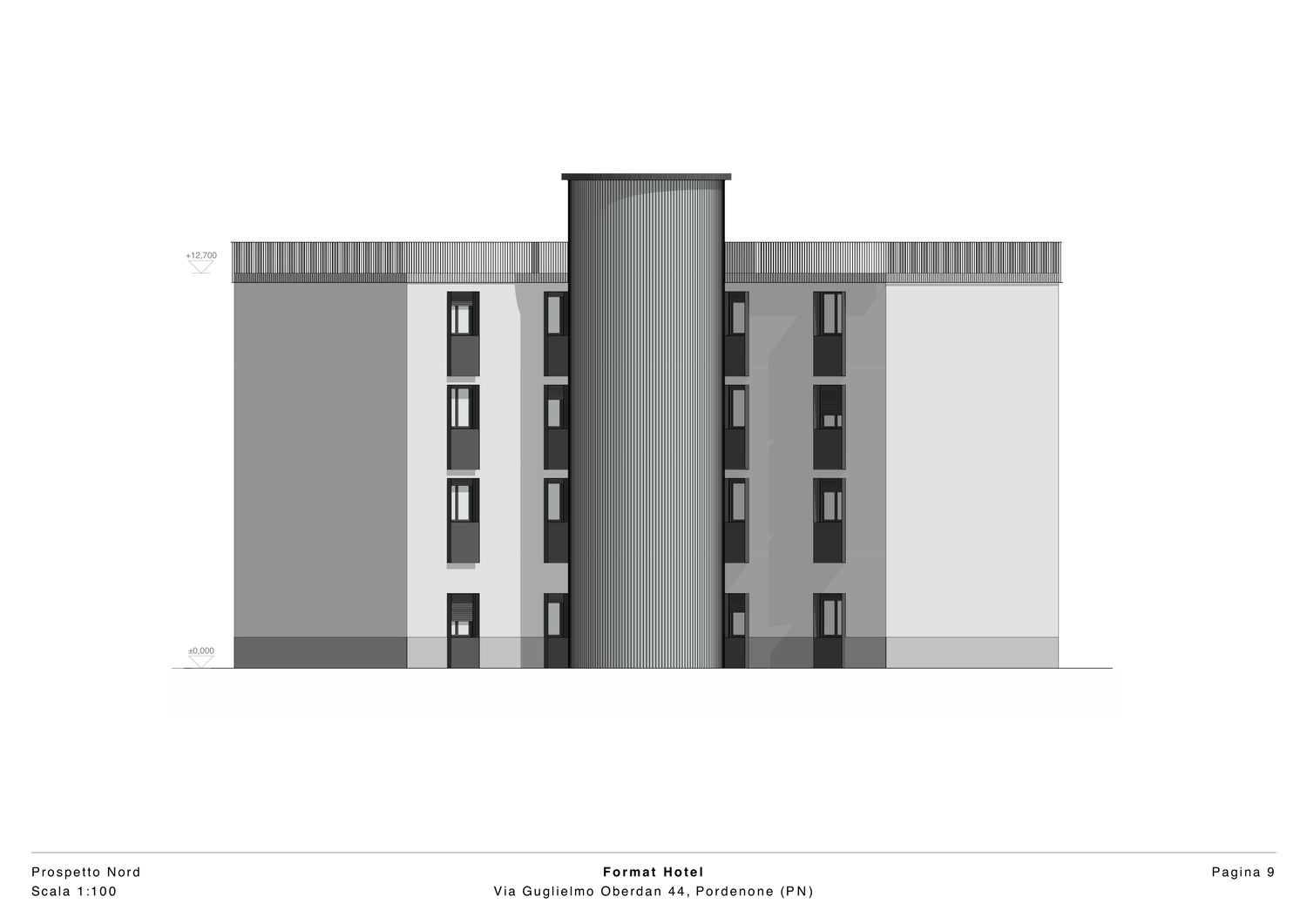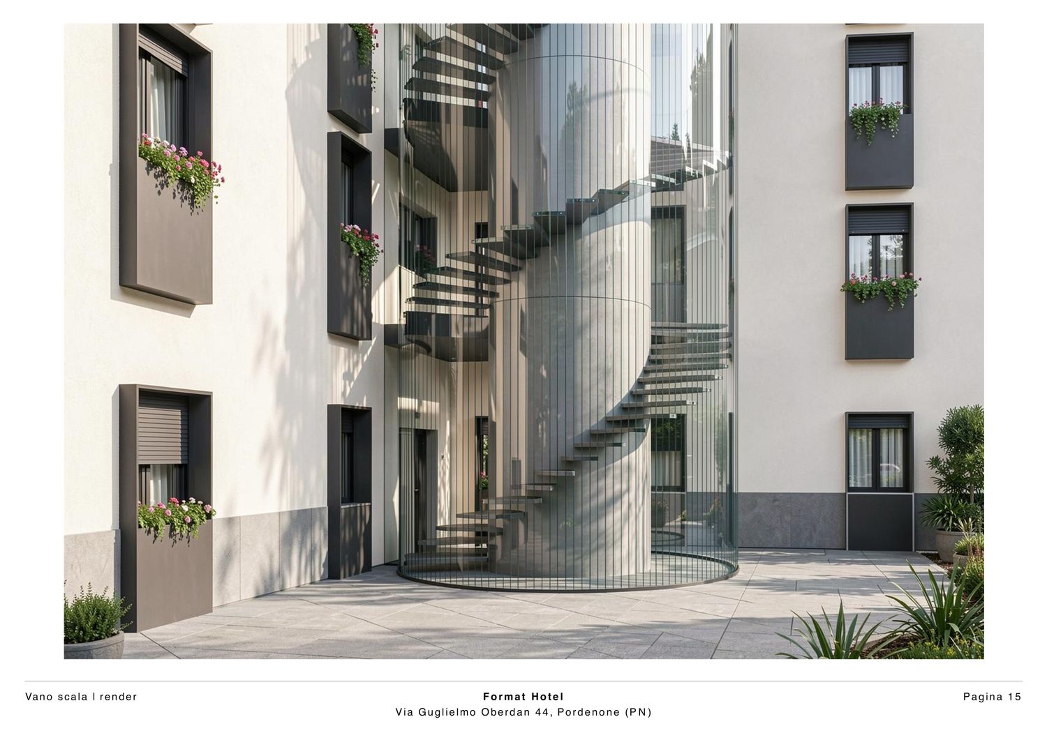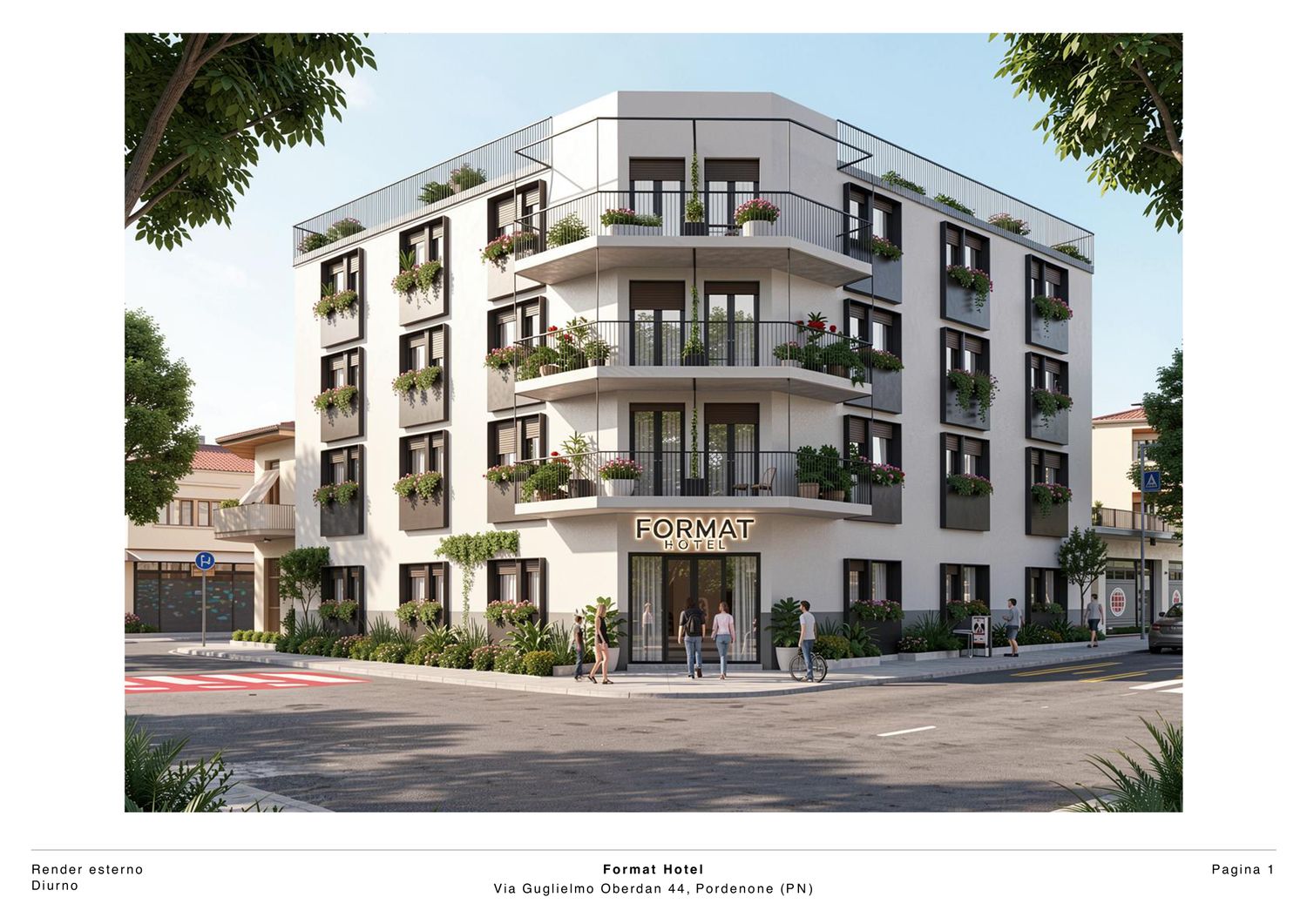 Il progetto riguarda un hotel situato nel contesto urbano di Pordenone e si caratterizza per un linguaggio architettonico contemporaneo, sobrio ed equilibrato, con particolare attenzione alla qualità estetica degli spazi esterni. L’edificio presenta una facciata principale impostata su una rigorosa simmetria compositiva, nella quale l’ordinata disposizione delle aperture e dei balconi contribuisce a definire un’immagine coerente, misurata e riconoscibile. Il rapporto tra pieni e vuoti è attentamente calibrato, garantendo una lettura chiara dei prospetti e una percezione complessiva di armonia formale.