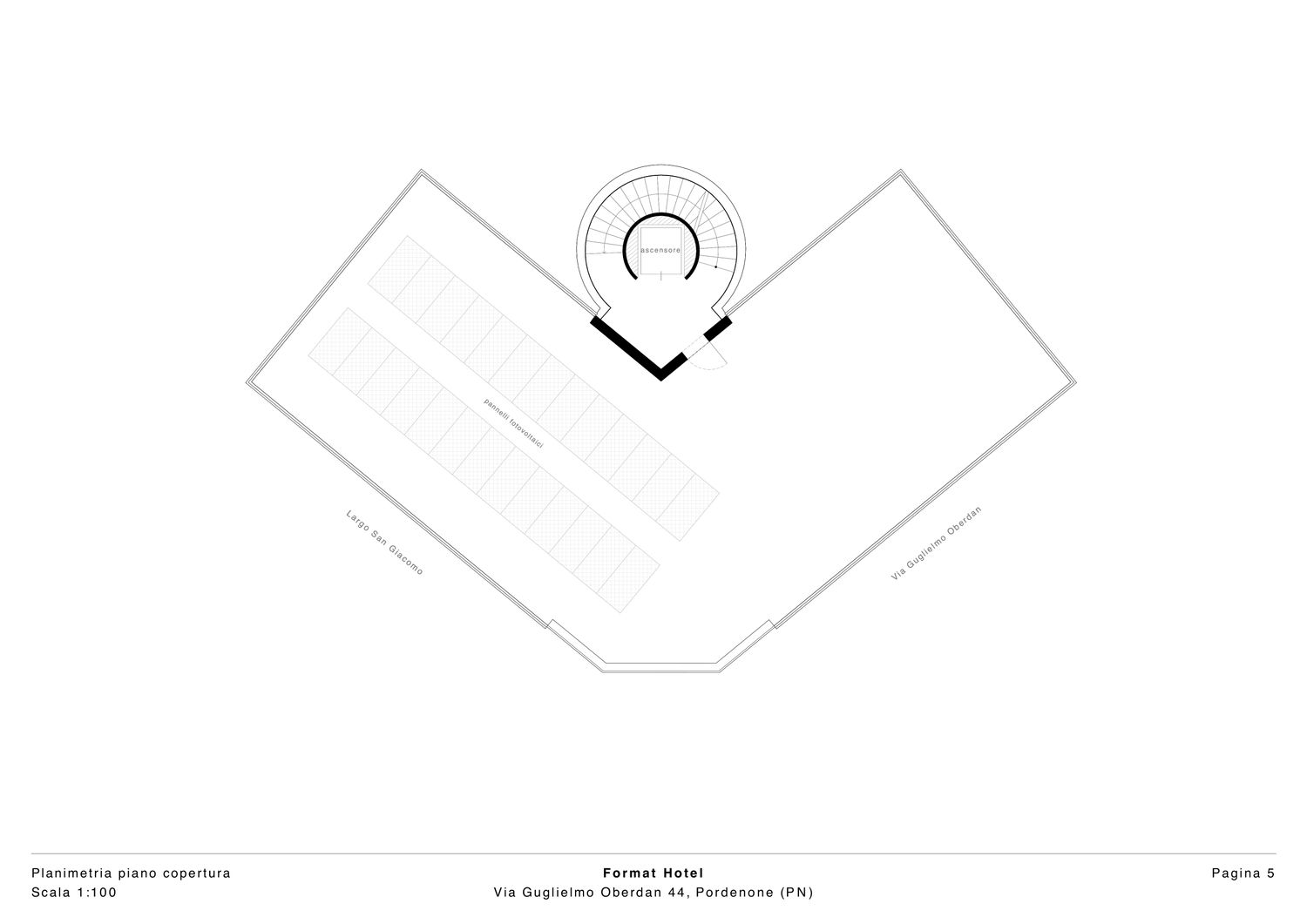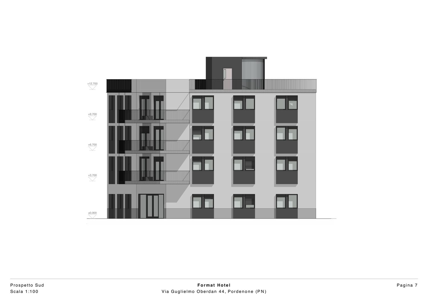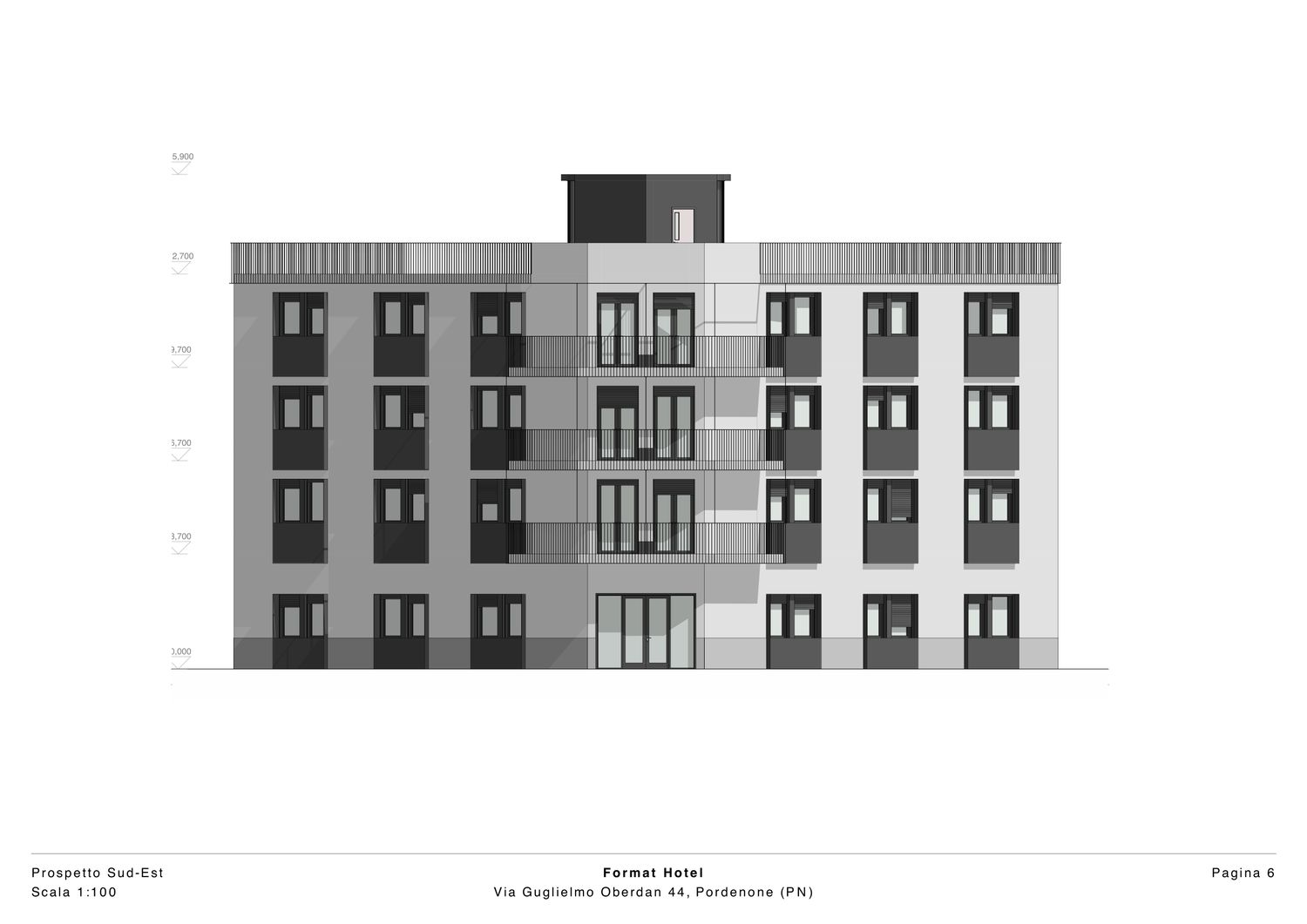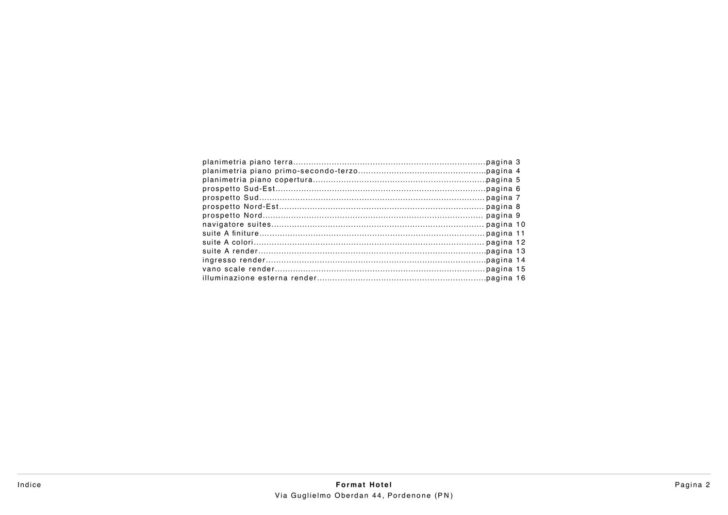Il progetto riguarda un hotel situato nel contesto urbano di Pordenone e si caratterizza per un linguaggio architettonico contemporaneo, sobrio ed equilibrato, con particolare attenzione alla qualità estetica degli spazi esterni. L’edificio presenta una facciata principale impostata su una rigorosa simmetria compositiva, nella quale l’ordinata disposizione delle aperture e dei balconi contribuisce a definire un’immagine coerente, misurata e riconoscibile. Il rapporto tra pieni e vuoti è attentamente calibrato, garantendo una lettura chiara dei prospetti e una percezione complessiva di armonia formale.
