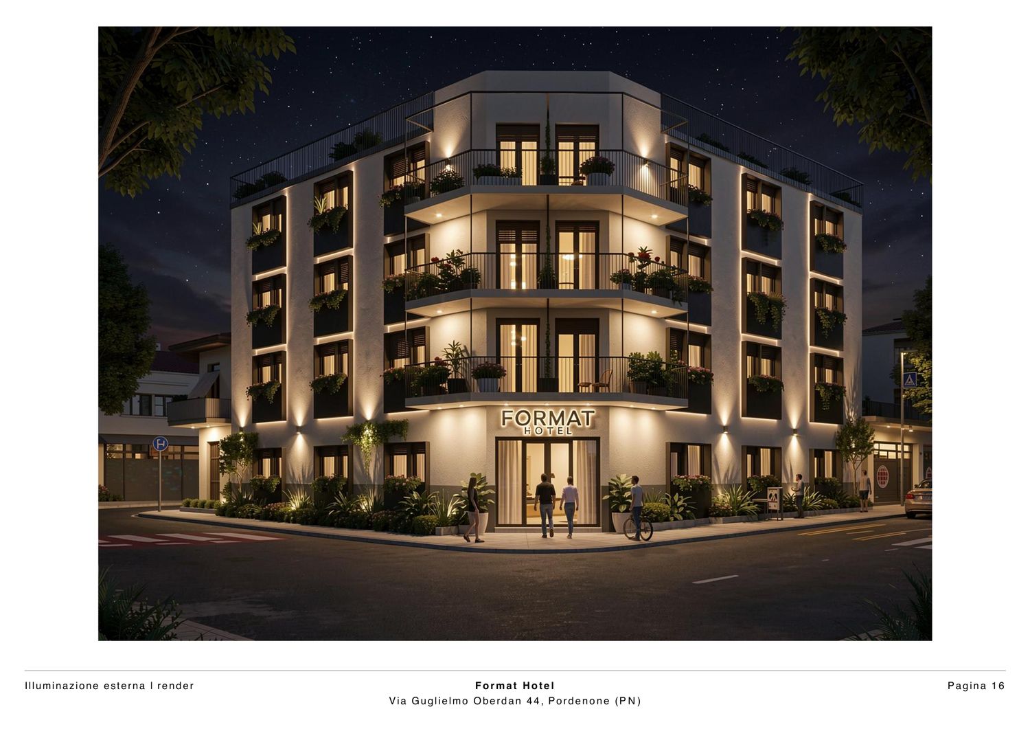 Si tratta di un'illuminazione minimalista ma gerarchica: gerarchia che parte dall'identificazione (insegna), passa per la lettura volumetrica notturna (linee verticali e spigoli illuminati) e termina con il comfort pedonale (luce a terra morbida e accogliente intorno all'ingresso e al marciapiede). Il risultato è elegante, contemporaneo e ben calibrato per un hotel di città .