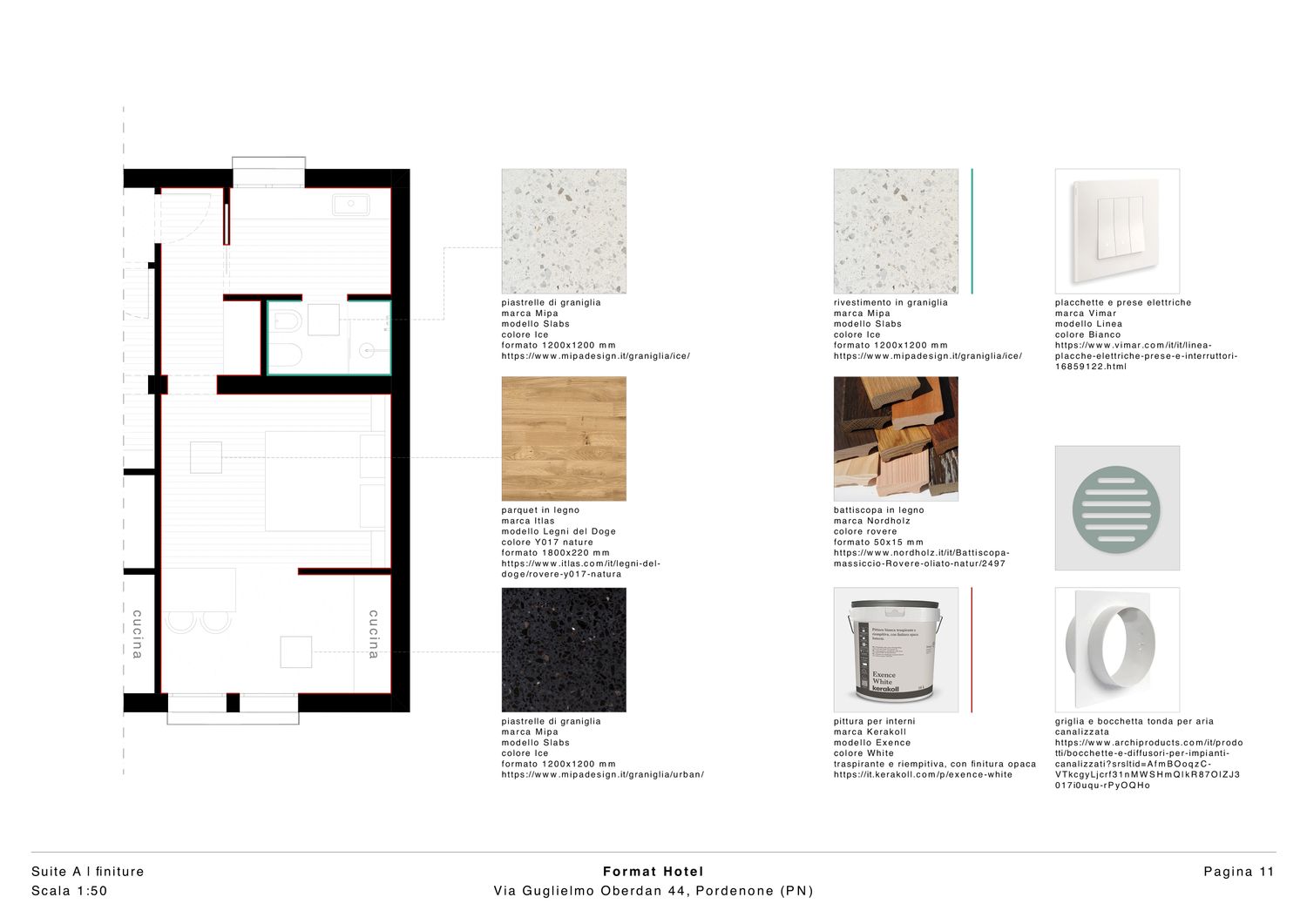 Le finiture sono selezionate per durabilitĂ , estetica e facilitĂ di manutenzione, tipiche di un contesto alberghiero. Predominano materiali di alta qualitĂ , con un mix di superfici opache e lucide per creare profonditĂ visiva.