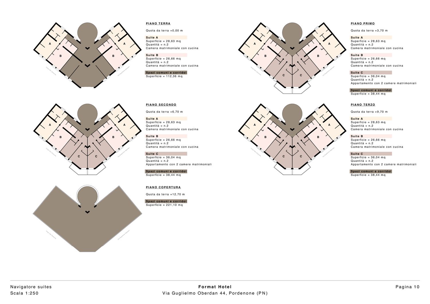 Il piano terra ospita 2 suites di tipo A e 2 suites di tipo B. I corridoi centrali e gli spazi comuni occupano una superficie di 112,36 mq, includendo aree di accesso ampie e trasformabili, oltre a servizi e ripostigli. La forma a V permette un flusso naturale verso l'ingresso principale.
