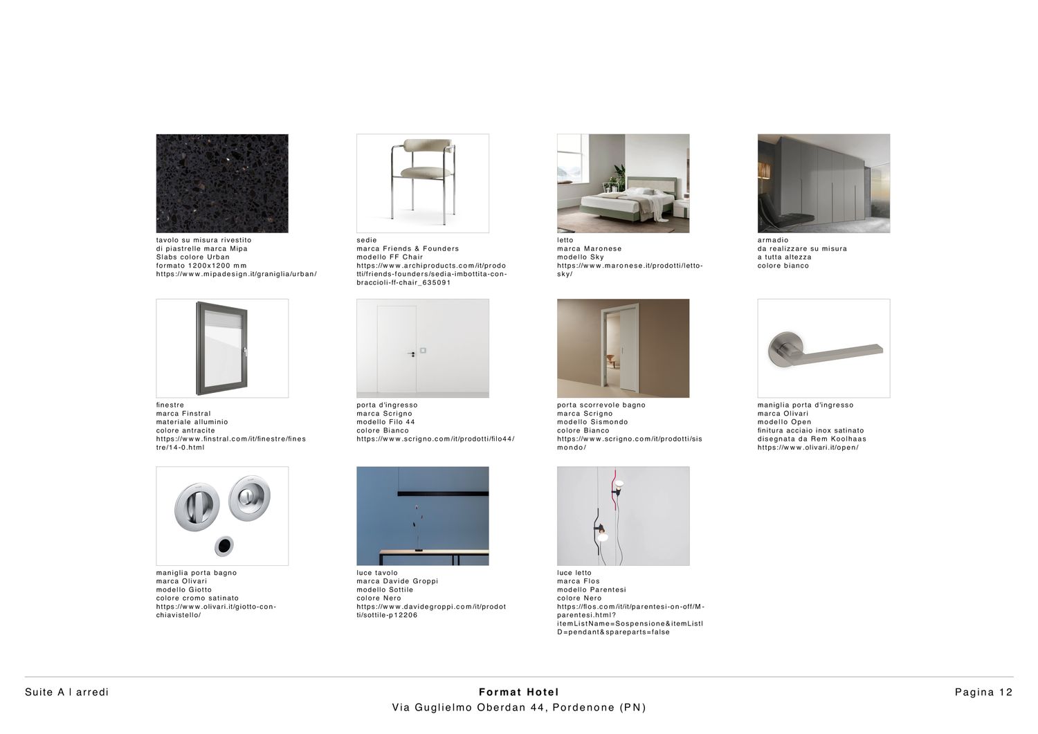 Gli arredi sono su misura o di design, selezionati da marchi italiani e internazionali per funzionalitĂ e stile. L'elenco enfatizza pezzi modulari e personalizzabili, con un focus su comfort e integrazione nello spazio.
