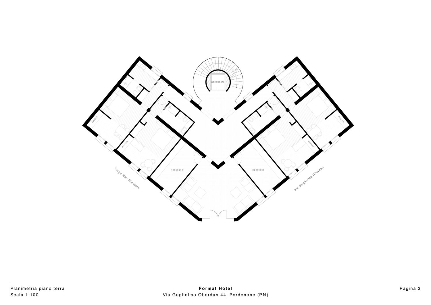 La planimetria generale dell'edificio adotta una forma a "V", con due ali simmetriche che si dipartono da un nucleo centrale. Il nucleo centrale ospita elementi di connessione verticale, tra cui un ascensore e una scala a chiocciola circolare, che fungono da fulcro distributivo per accedere alle suites.