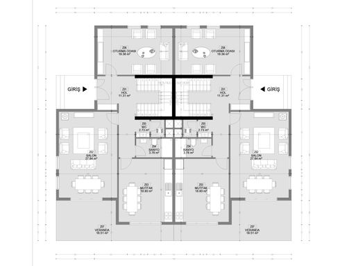 I would like to build a building, after demolishing the existing one, to be used as independent four-family residences. schematically mirrored, therefore, planimetrically it is necessary to design two. the lot has one side facing a municipal road and all the others bordered by private buildings. the apartments must be arranged on three levels, basement, mezzanine and first floor, with the possibility of having an additional room in the attic floor. all environments must be illuminated, a modern, bright style is preferred, with references to a contemporary style.