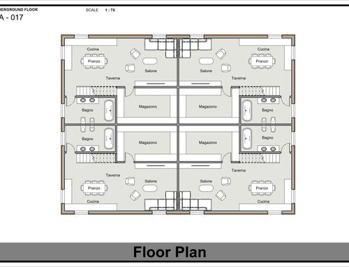 vorrei realizzare un corpo di fabbrica, previa demolizione dell'esistente, da destinare a residenze quadrifamiliare indipendenti. schematicamente specchiati, pertanto, planimetricamente occorre progettarne due. il lotto ha un lato prospiciente una strada comunale e tutti gli altri delimitati da costruzioni private. gli appartamenti dovranno essere disposti su tre livelli, seminterrato, piano rialzato e piano primo, con la possibilità di avere un ulteriore ambiente nel piano sottotetto. tutti gli ambienti devono essere illuminati, si predilige uno stile moderno, luminoso, con richiami ad uno stile contemporaneo.