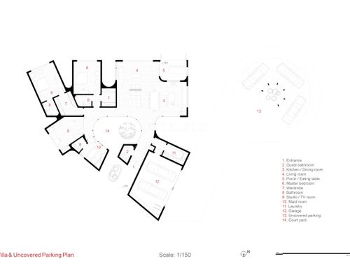I want to build a house on one floor without a step of 250 m2 max, with a swimming pool in front, a large kitchen with living room, sitting room, 2 master bedrooms, 2 master bathrooms and 1 guest bathroom, a studio with a sofa bed and TV room, a large laundry room, 1 bedroom with bathroom for the maid, a wardrobe room, 2 covered parking spaces and a shed for 3 uncovered parking spaces, a large shed in front of the kitchen and a swimming pool with a large table for eating and sofas , all of which can be closed in the colder seasons with a glass window. from the street I would like only the parking spaces, the garage and the entrance door and I would like the whole house to face south.
