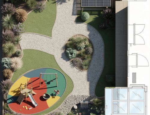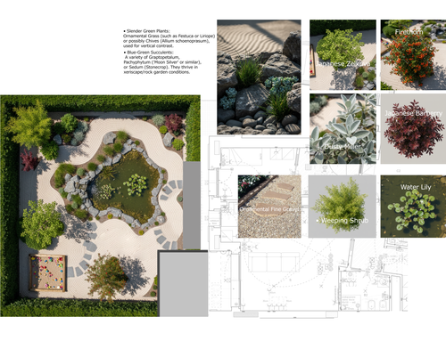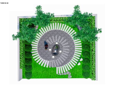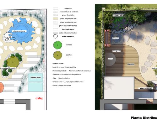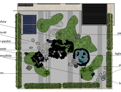 I would like to design a kindness and charming garden area for my family, I would like a mini pond to put water plant and a small fountain next to the wall, an area for kids play, and change grass with other kind of plant or stone like Zen Garden to save water. the garden during summer has a solar exposition of about 9 hours from 11.00 am to 19.00 pm. There's an area that cannot be changed is on the right corner where ther's two solar Panel of about 3 square meter area, I would cover the space under the support with plant. The Garden to design in the Cad File is the biggest one.