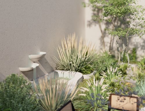Quisiera incluir un pequeño estanque con plantas acuáticas y una fuente pequeña junto al muro, un área de juegos para niños, y reemplazar el césped por otro tipo de planta o por piedras/gravilla estilo jardín zen para ahorrar agua.