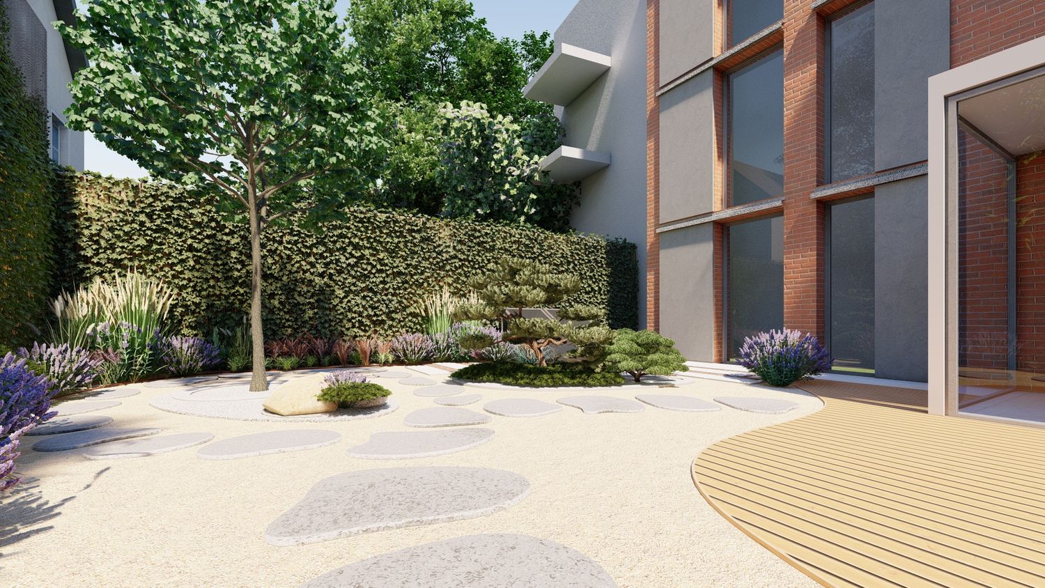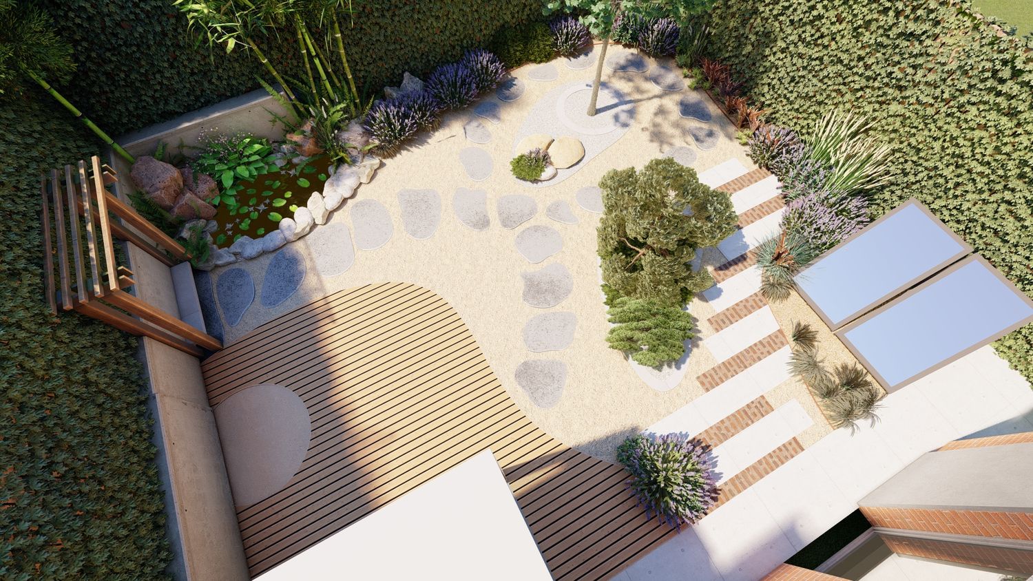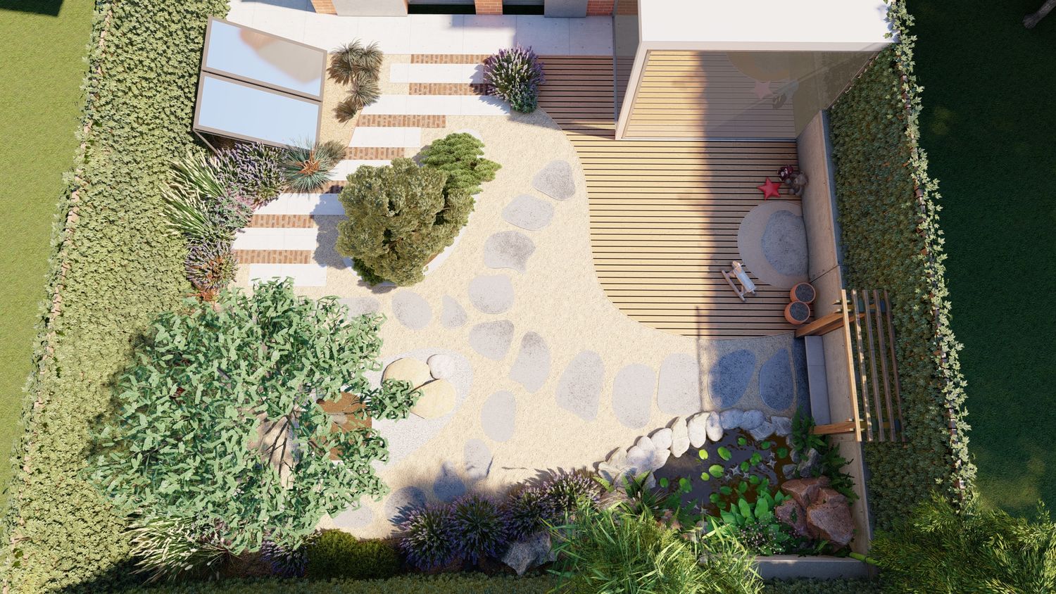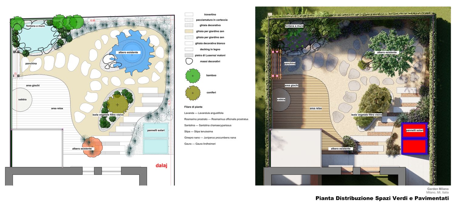 Il progetto propone un giardino contemporaneo ispirato ai principi dei giardini zen e mediterranei, progettato per ridurre il prato e creare uno spazio armonioso, naturale e a bassa manutenzione. La superficie principale è realizzata in ghiaia decorativa con un percorso organico in pietra naturale che collega le diverse aree del giardino. Un mini stagno con piccola cascata tra i massi introduce l’elemento dell’acqua come punto focale e crea un’atmosfera rilassante. Al centro, un’isola vegetale con alberi ornamentali e piante mediterranee struttura lo spazio, mentre una zona relax con pergola e deck in legno offre uno spazio accogliente vicino alla casa. Una fascia di vegetazione alta funge da filtro visivo per integrare i pannelli solari nel paesaggio senza ridurre l’esposizione al sole. Il risultato è un giardino equilibrato dove acqua, pietra e vegetazione creano un ambiente naturale, elegante e sostenibile.