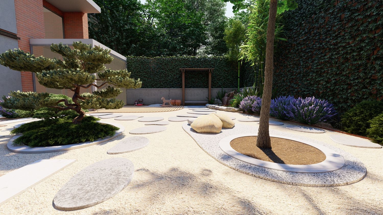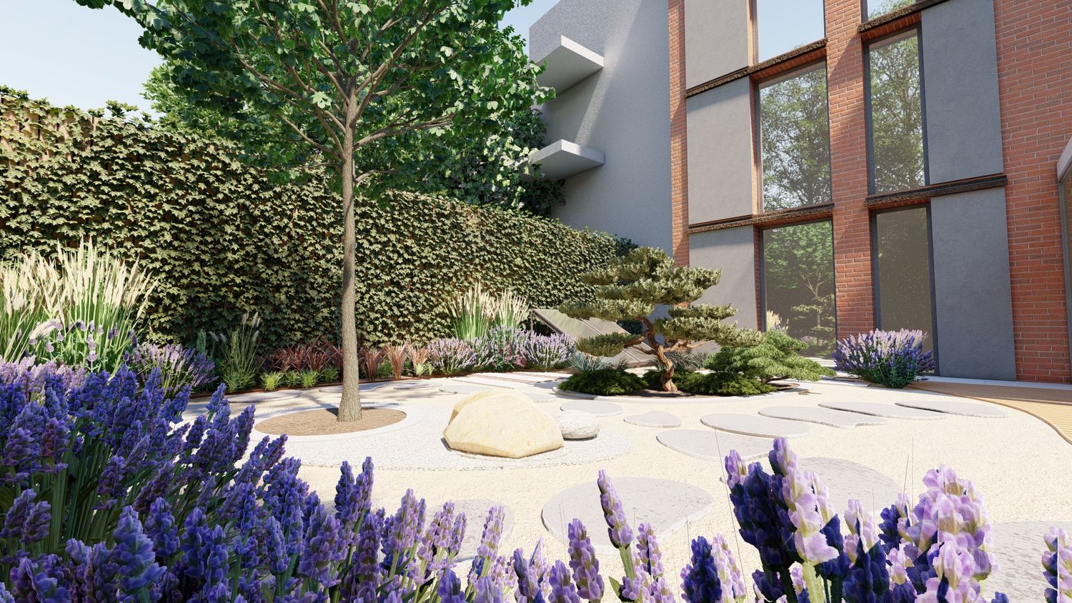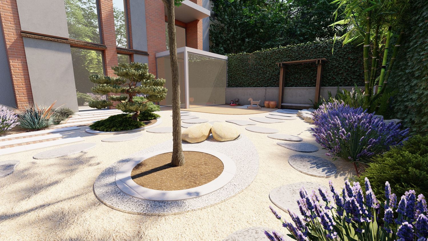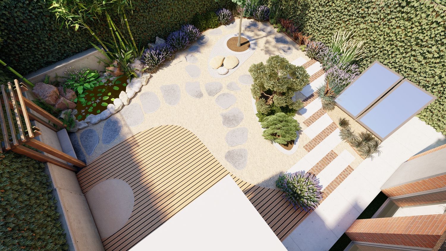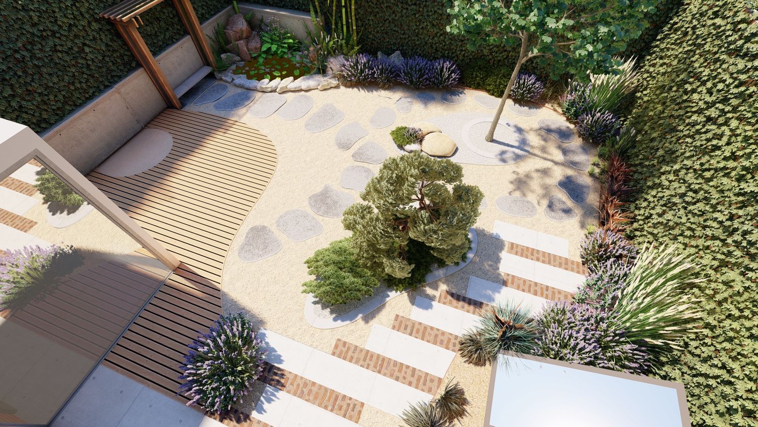 Il progetto propone un giardino contemporaneo ispirato ai principi dei giardini zen e mediterranei, progettato per ridurre il prato e creare uno spazio armonioso, naturale e a bassa manutenzione. La superficie principale è realizzata in ghiaia decorativa con un percorso organico in pietra naturale che collega le diverse aree del giardino. Un mini stagno con piccola cascata tra i massi introduce l’elemento dell’acqua come punto focale e crea un’atmosfera rilassante. Al centro, un’isola vegetale con alberi ornamentali e piante mediterranee struttura lo spazio, mentre una zona relax con pergola e deck in legno offre uno spazio accogliente vicino alla casa. Una fascia di vegetazione alta funge da filtro visivo per integrare i pannelli solari nel paesaggio senza ridurre l’esposizione al sole. Il risultato è un giardino equilibrato dove acqua, pietra e vegetazione creano un ambiente naturale, elegante e sostenibile.