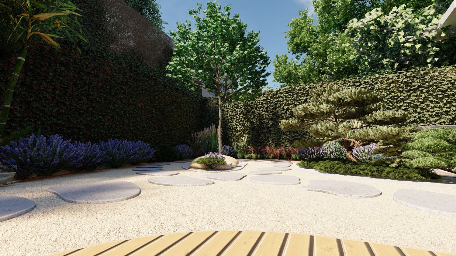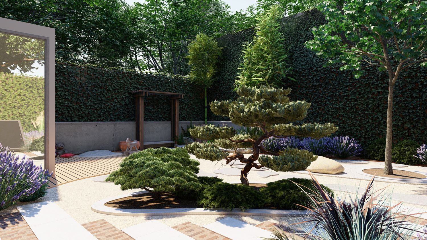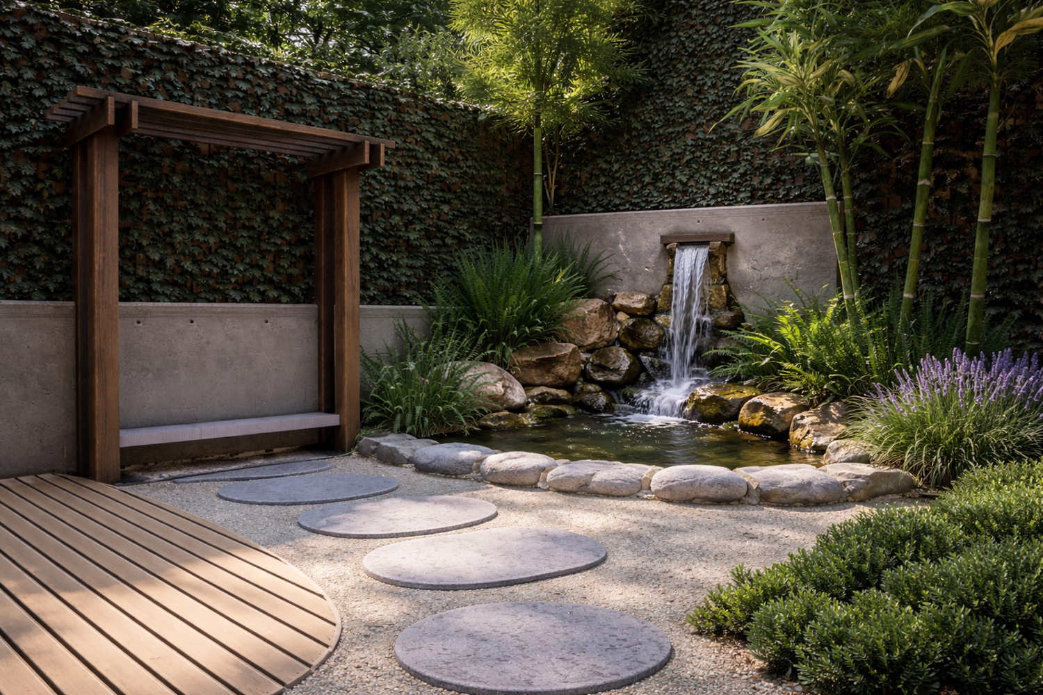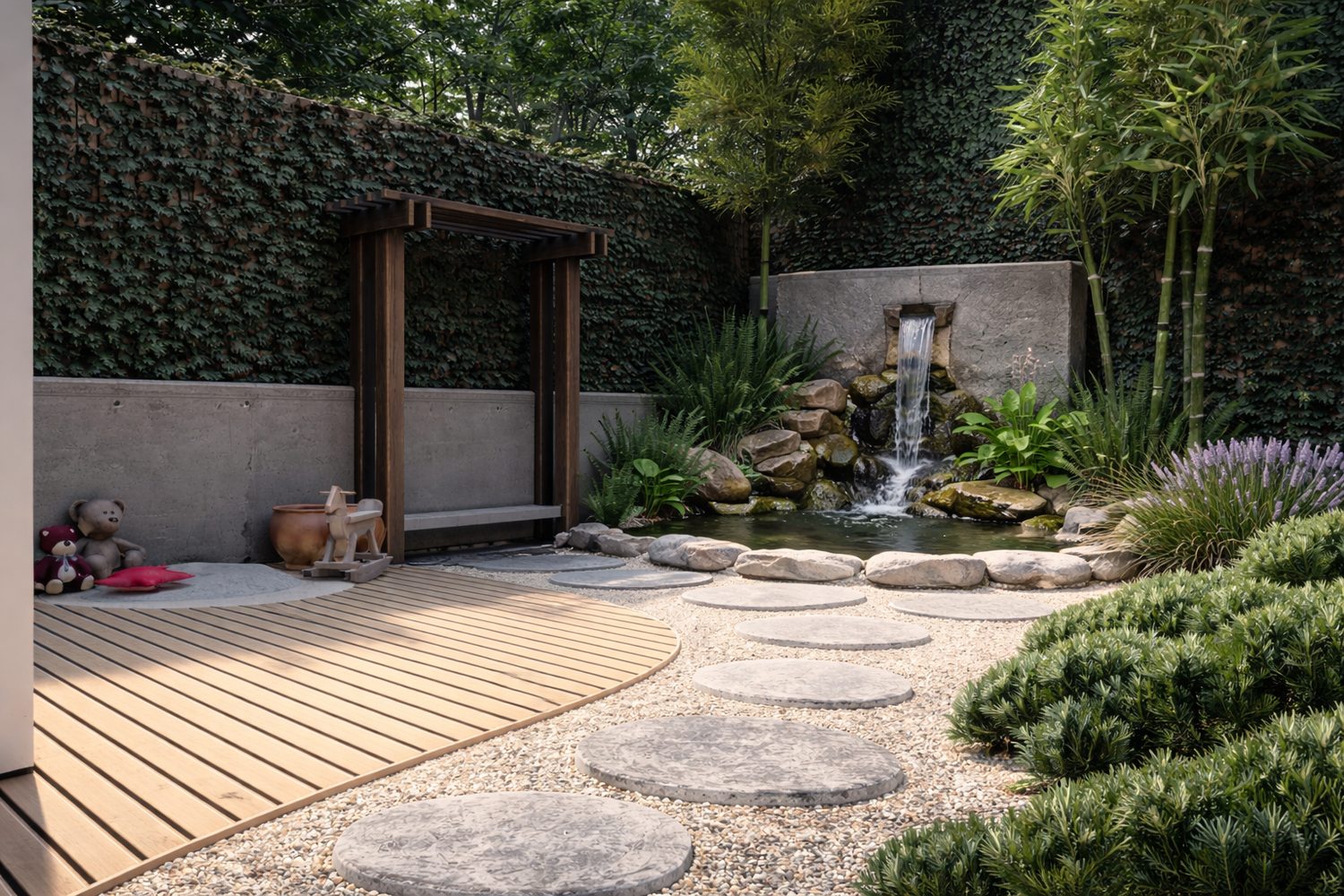 Il progetto propone un giardino contemporaneo ispirato ai principi dei giardini zen e mediterranei, progettato per ridurre il prato e creare uno spazio armonioso, naturale e a bassa manutenzione. La superficie principale è realizzata in ghiaia decorativa con un percorso organico in pietra naturale che collega le diverse aree del giardino. Un mini stagno con piccola cascata tra i massi introduce l’elemento dell’acqua come punto focale e crea un’atmosfera rilassante. Al centro, un’isola vegetale con alberi ornamentali e piante mediterranee struttura lo spazio, mentre una zona relax con pergola e deck in legno offre uno spazio accogliente vicino alla casa. Una fascia di vegetazione alta funge da filtro visivo per integrare i pannelli solari nel paesaggio senza ridurre l’esposizione al sole. Il risultato è un giardino equilibrato dove acqua, pietra e vegetazione creano un ambiente naturale, elegante e sostenibile.