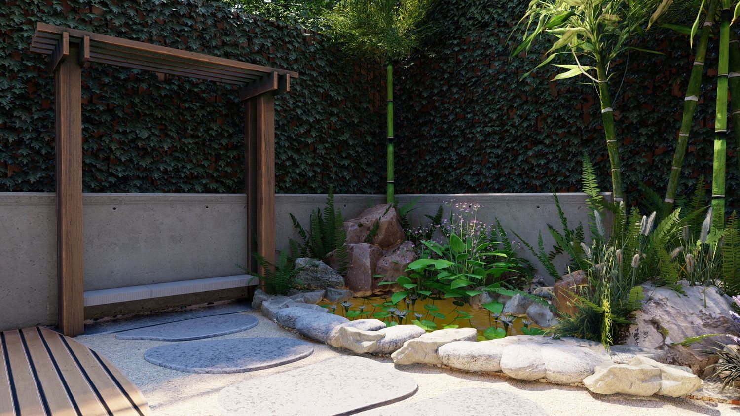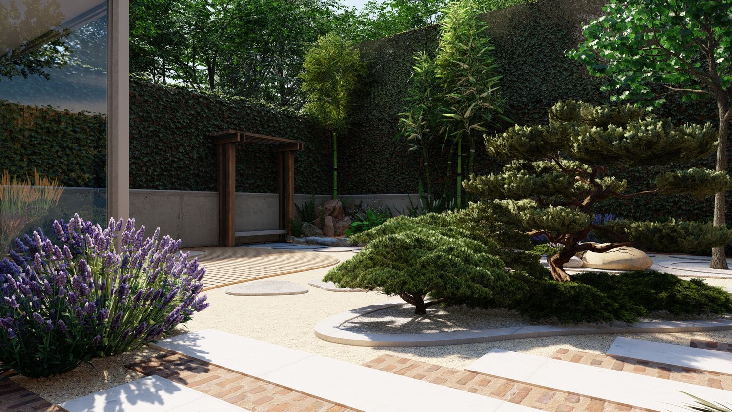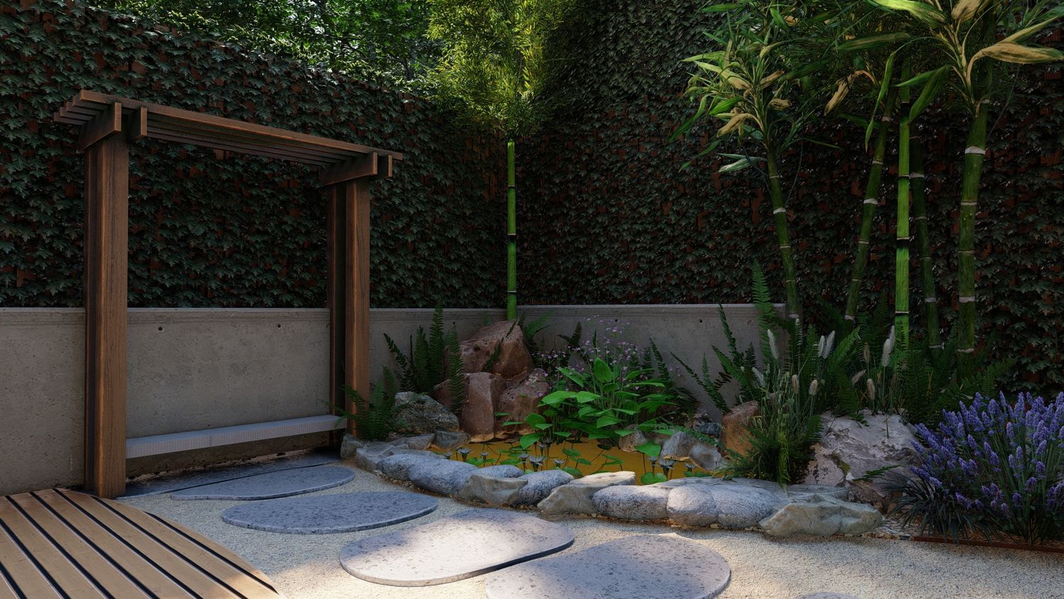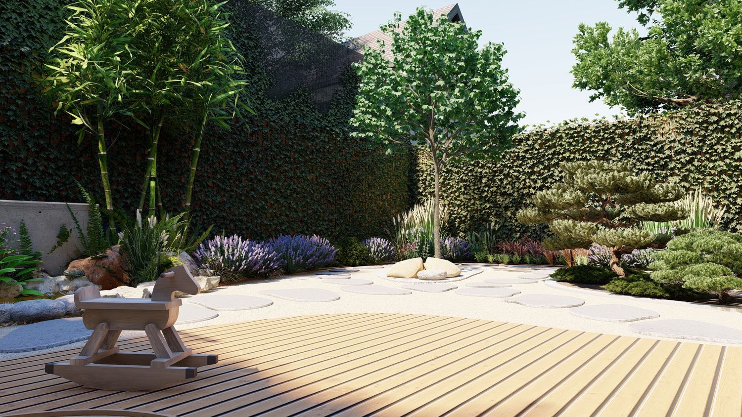 Il progetto propone un giardino contemporaneo ispirato ai principi dei giardini zen e mediterranei, progettato per ridurre il prato e creare uno spazio armonioso, naturale e a bassa manutenzione. La superficie principale è realizzata in ghiaia decorativa con un percorso organico in pietra naturale che collega le diverse aree del giardino. Un mini stagno con piccola cascata tra i massi introduce l’elemento dell’acqua come punto focale e crea un’atmosfera rilassante. Al centro, un’isola vegetale con alberi ornamentali e piante mediterranee struttura lo spazio, mentre una zona relax con pergola e deck in legno offre uno spazio accogliente vicino alla casa. Una fascia di vegetazione alta funge da filtro visivo per integrare i pannelli solari nel paesaggio senza ridurre l’esposizione al sole. Il risultato è un giardino equilibrato dove acqua, pietra e vegetazione creano un ambiente naturale, elegante e sostenibile.