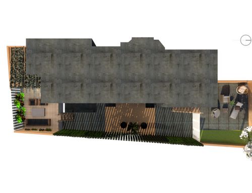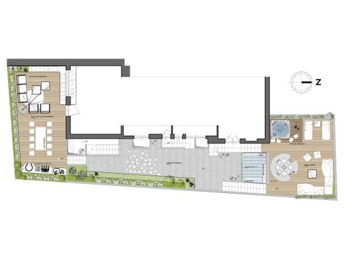 El espacio se abre al norte y al sur mientras que a los lados se encuentran los edificios bastante juntos. Esto le permite tener el sol principalmente por la mañana en invierno (y frente a la sala de estar también a la hora del almuerzo), mientras que en verano el sol también está presente al final de la tarde en la terraza sobre el garaje.