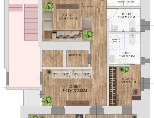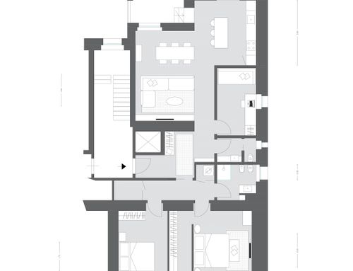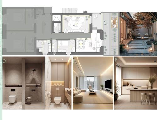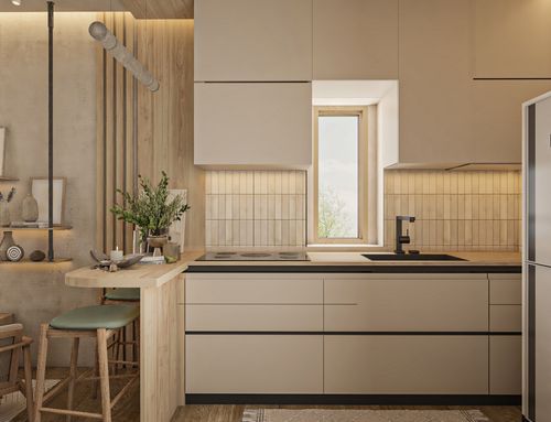 Since the apartment is on the ground floor and has limited natural light, I prefer light colours combined with wooden furniture. Regarding the kitchen, I would like to divide it into two areas: one for cooking and another as a dining room.