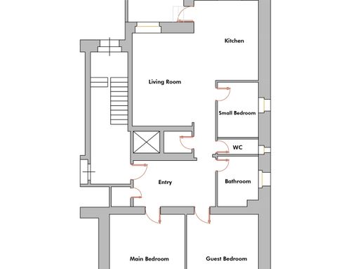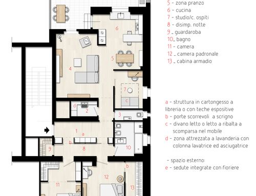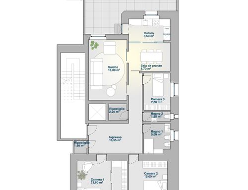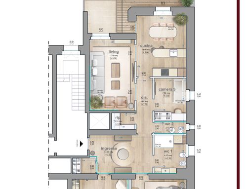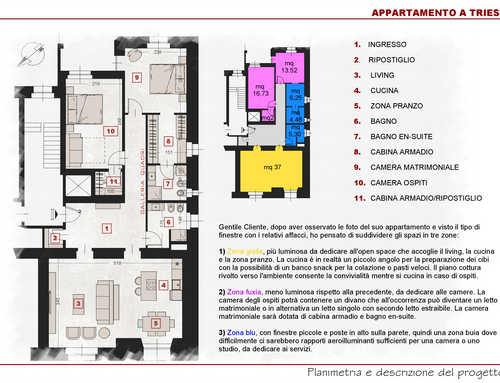 Dato che l’appartamento si trova al piano terra e ha poca luce naturale, preferirei colori chiari abbinati a mobili in legno. Per quanto riguarda la cucina, vorrei dividerla in due aree: una per la preparazione e l’altra come sala da pranzo.