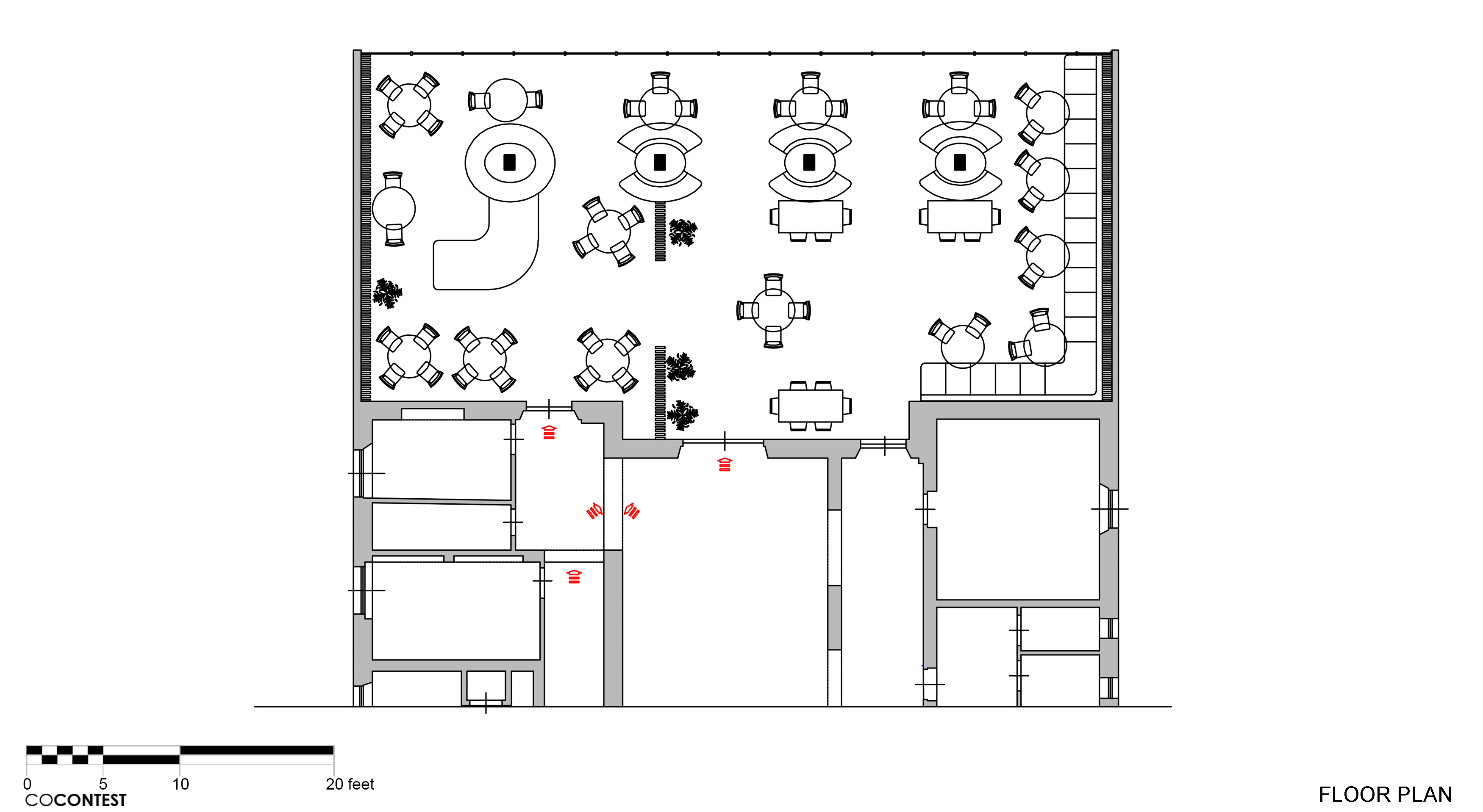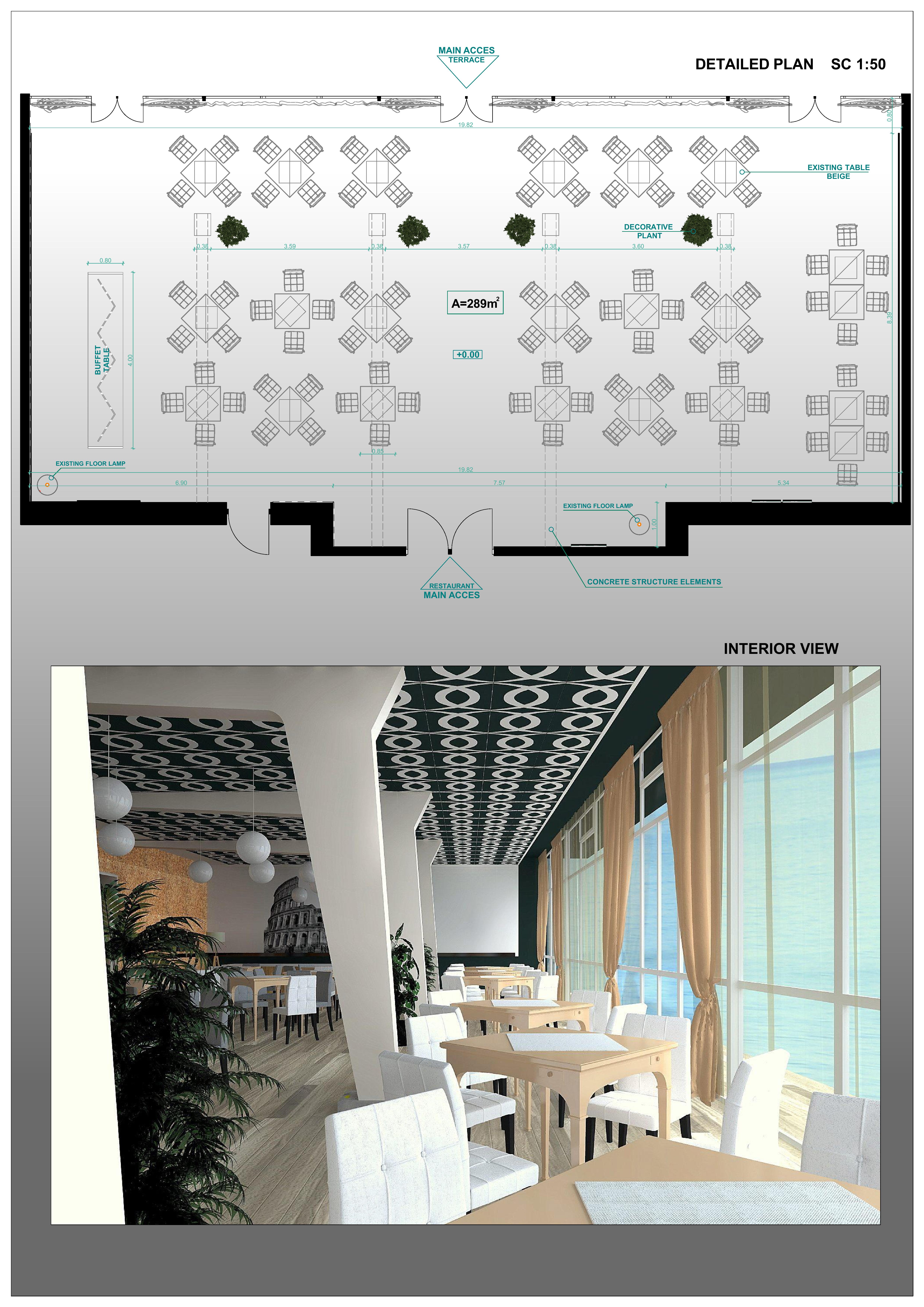 I would like to obtain an informal but sophisticated elegant and warm ambience since this dinner room has a big glasswall on the seaside - room is inserted into an hotel with colonial-style external facades - dinner floor has ceramic tiles with linear wooded appearance (140cmx20cm each disposed long side of tile parrallel to seasidewall - colour walnut ) - I would like to do something on the perimeter walls to enrich and transform the entire ambiance - - (rooftop is made of gypsum panels 60x60 non transformable, should remain as it is) - lateral walls eastern and western side are very thin (10cm) so they cannot sustain heavy weights - ceiling could be repainted not more - Tables shown in drawing are about as actually disposed, but their disposition is not fix, notice the dinner rrom should give seating to max 98 persons, with preference to giving most of them the best view to the glass-wall facing to the beach and sea - anyway I am interested in enriching the walls and their appearance the most. reference pics are just as example to display liked athmospheres and materials but am open to any good idea
