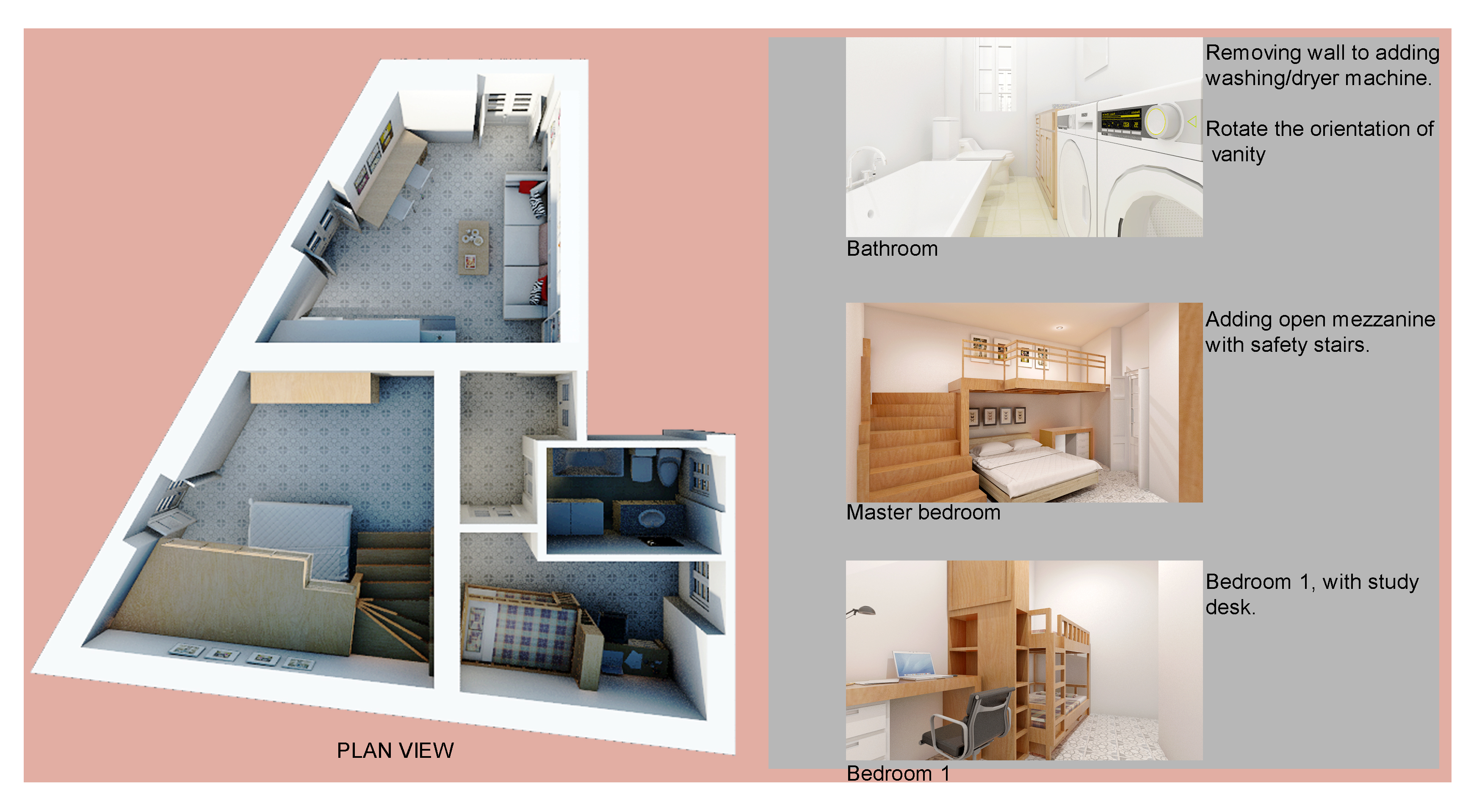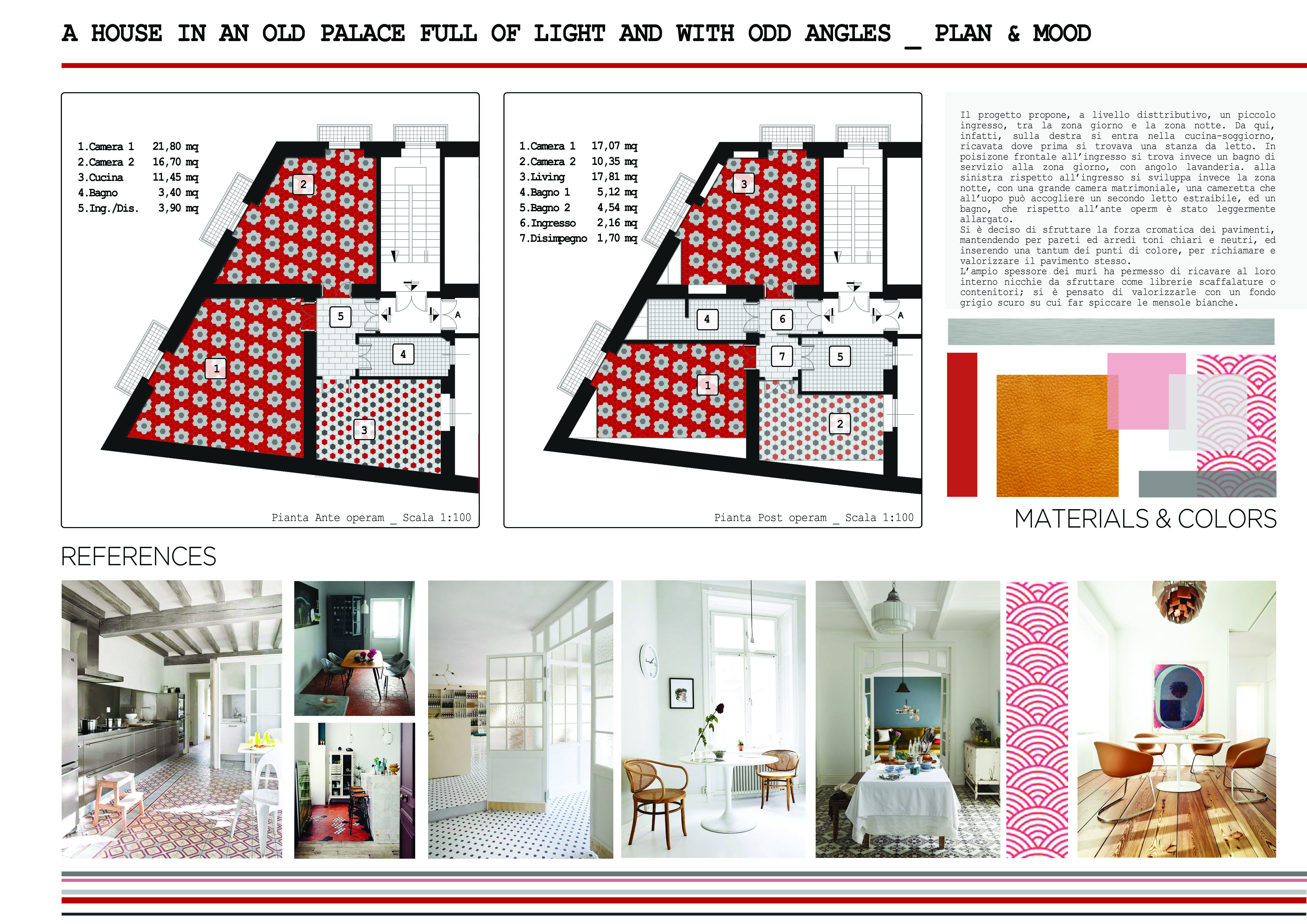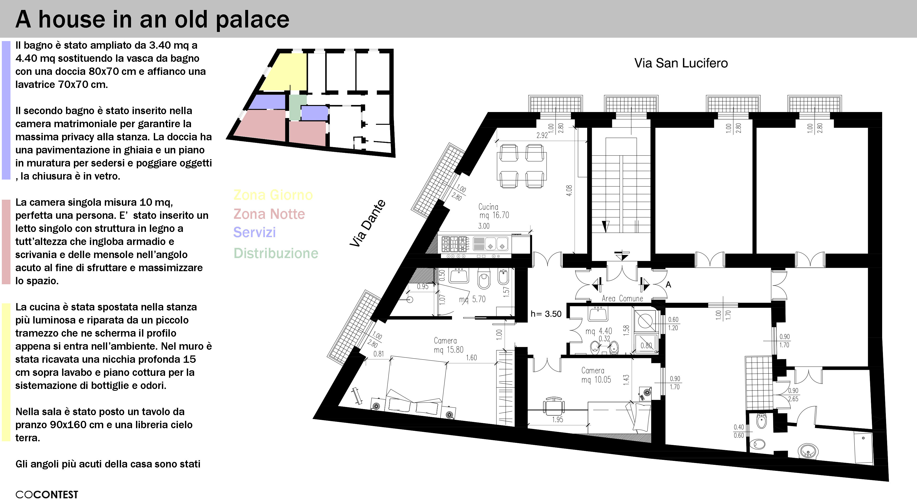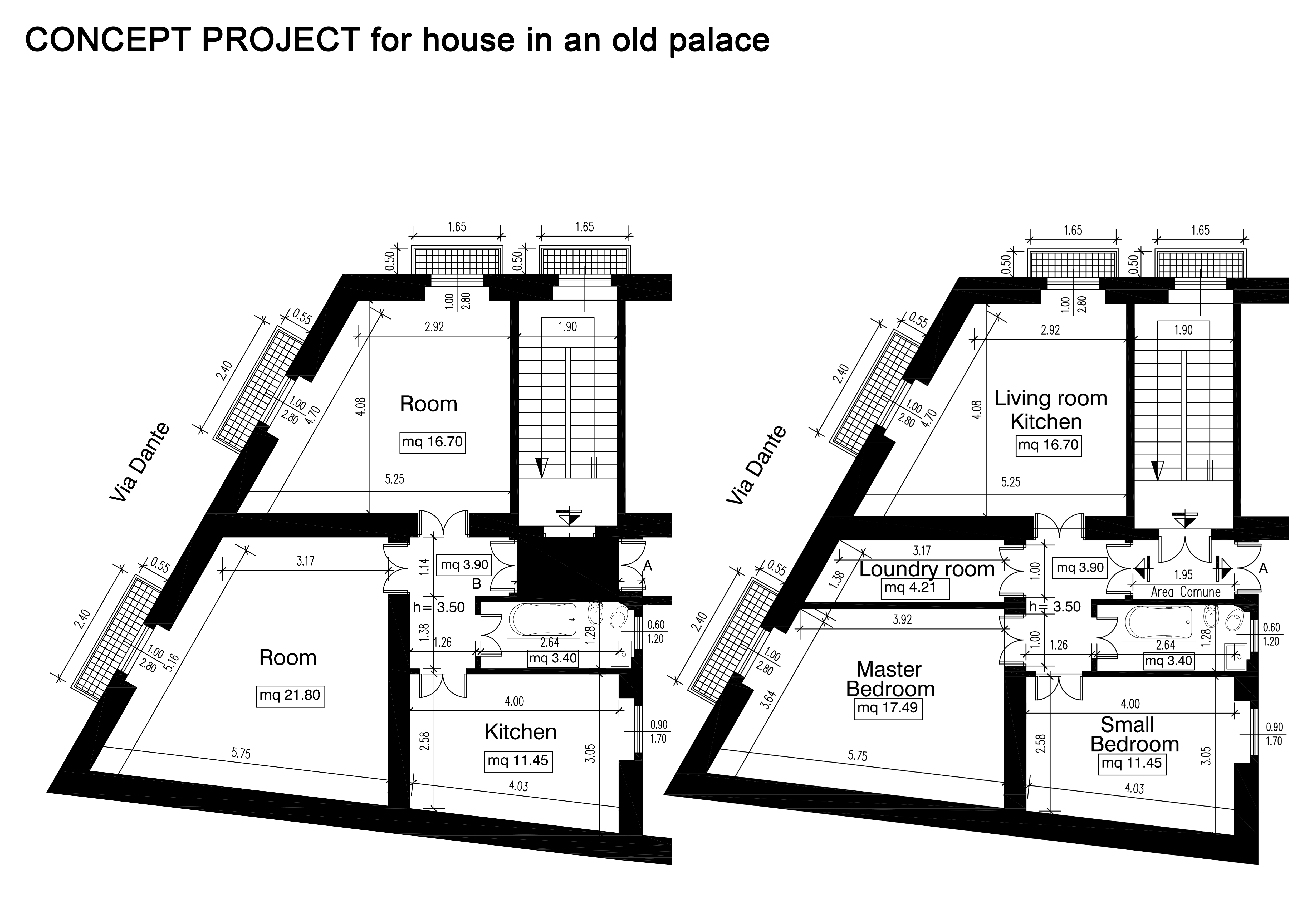 L'appartamento si trova in un palazzo del 1935, nel centro di Cagliari. Attualmente dispone di due grandi stanze con portefinestre e balconcini, una piccola cucina e un bagno piccolo, stretto e lungo. Si trova al primo piano di due. Il perimetro dell'appartamento è molto irregolare, in quanto segue l'andamento delle due strade ad angolo che lo delimitano, determinando un'area trapezoidale. La cucina è piccola, e mi piacerebbe trasformarla in una camera da letto, per ricavare la cucina nella stanza con doppia apertura, la più luminosa della casa. Si potrebbe anche pensare di spostare il muro fra bagno e attuale cucina, per avere più spazio in bagno. Infatti il bagno dovrebbe ospitare anche una lavatrice e un'asciugatrice. Sarebbe fantastico ricavare un secondo bagno da qualche parte.
