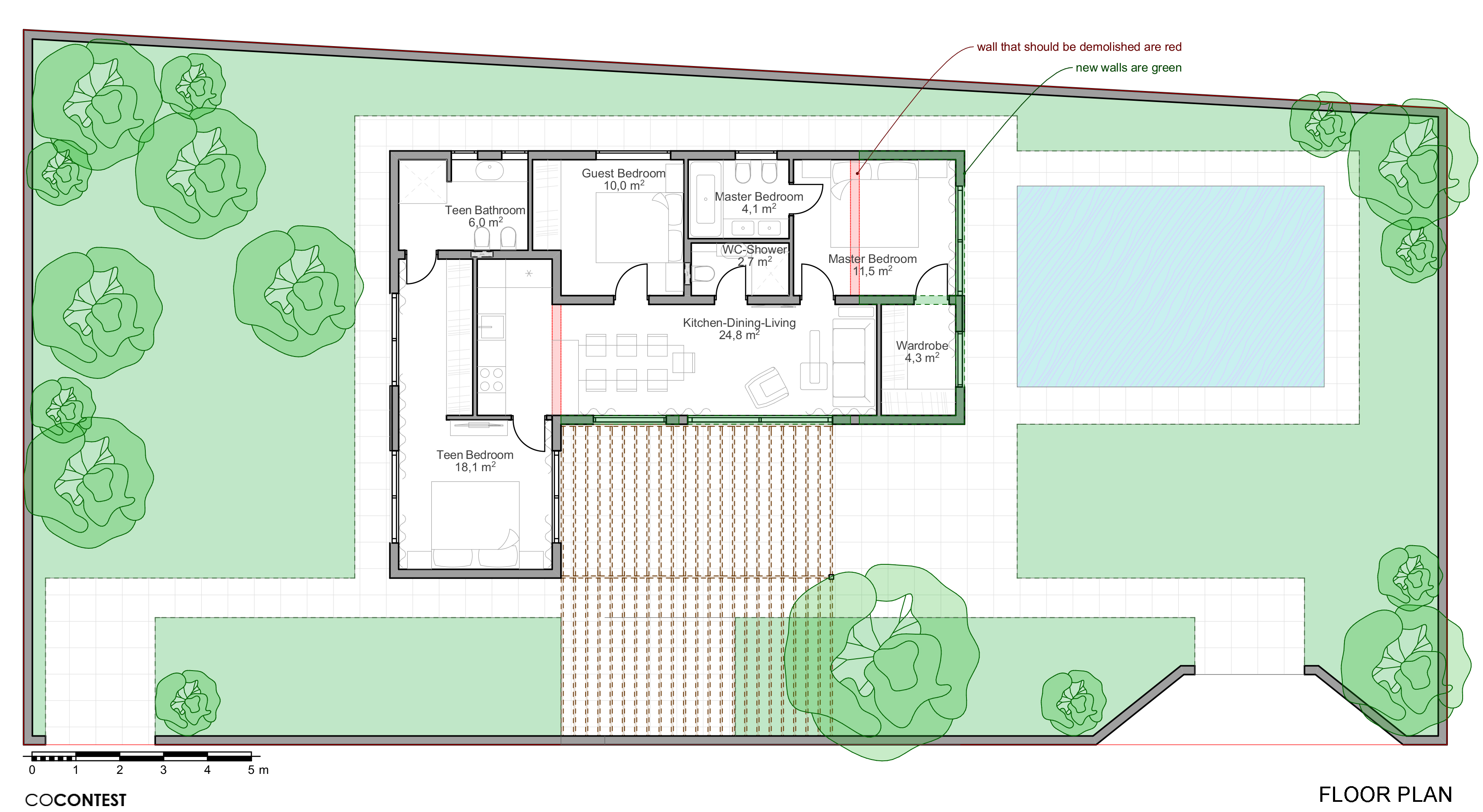 Valorizzare giardino pergolato e portico, creando un’ampia zona living dining relax (anche eliminando le finestre e la porta di accesso dell’attuale zona notte) .