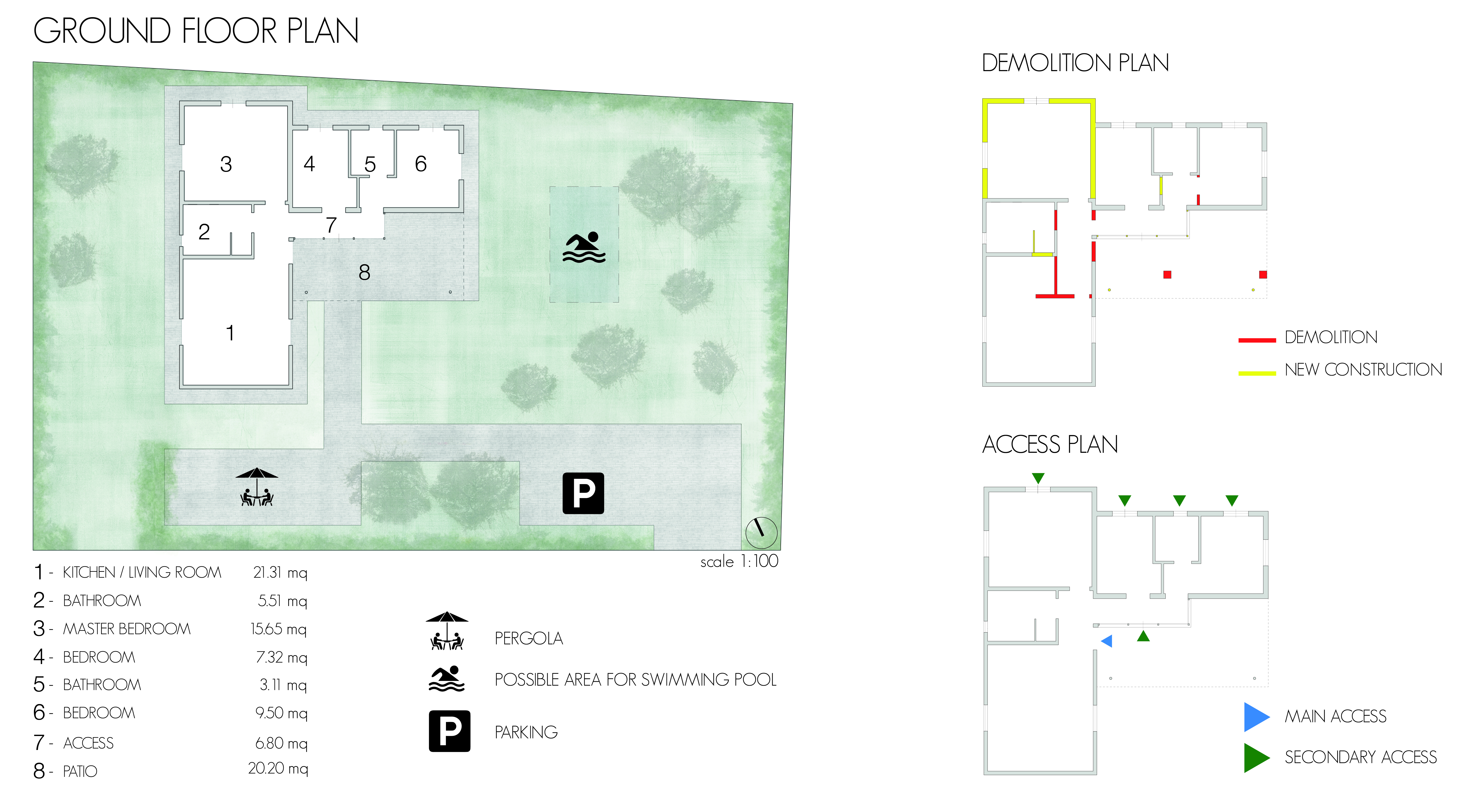 Ricavare una terza camera da letto con bagno, comunicante con la casa, ma con accesso anche da porta/finestra sul giardino retrostante al fine di creare una soluzione indipendente per un ragazzo di anni 16 (esiste, come già detto un altro cancello su strada) e sfruttare al meglio il giardino retrostante ora poco vissuto.