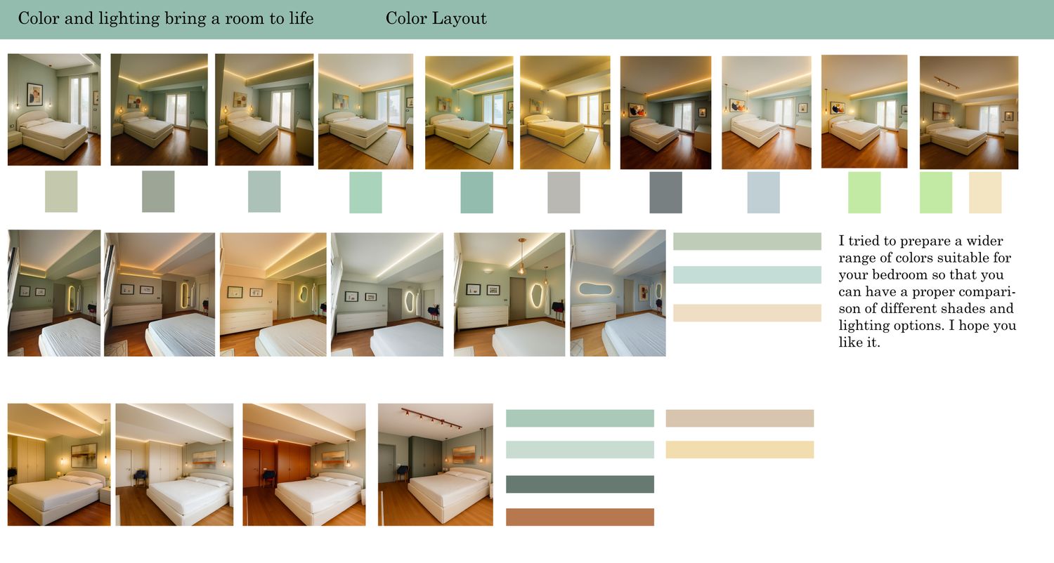 I tried to prepare a wider range of colors suitable for your bedroom so that you can have a proper comparison of different shades and lighting options. I hope you like it.