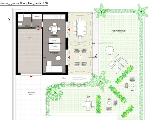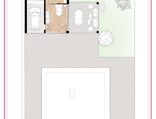 Please redesign the entire interior of the garage. You do not need to maintain the existing office or lofts but I do want some storage space. Please also redesign the yard to include a patio for outdoor dinning.