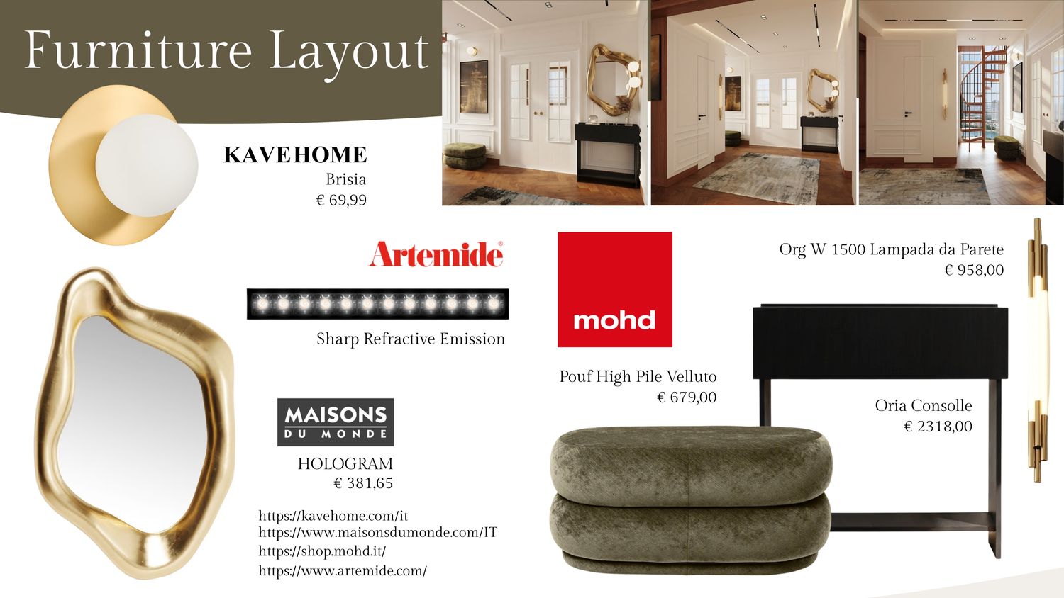 È stato previsto un piccolo consolle funzionale per chiavi e posta, con arredi selezionati da marchi italiani reperibili sul mercato. La scala a chiocciola rimane visibile, valorizzando la luce naturale e l’elemento architettonico esistente.