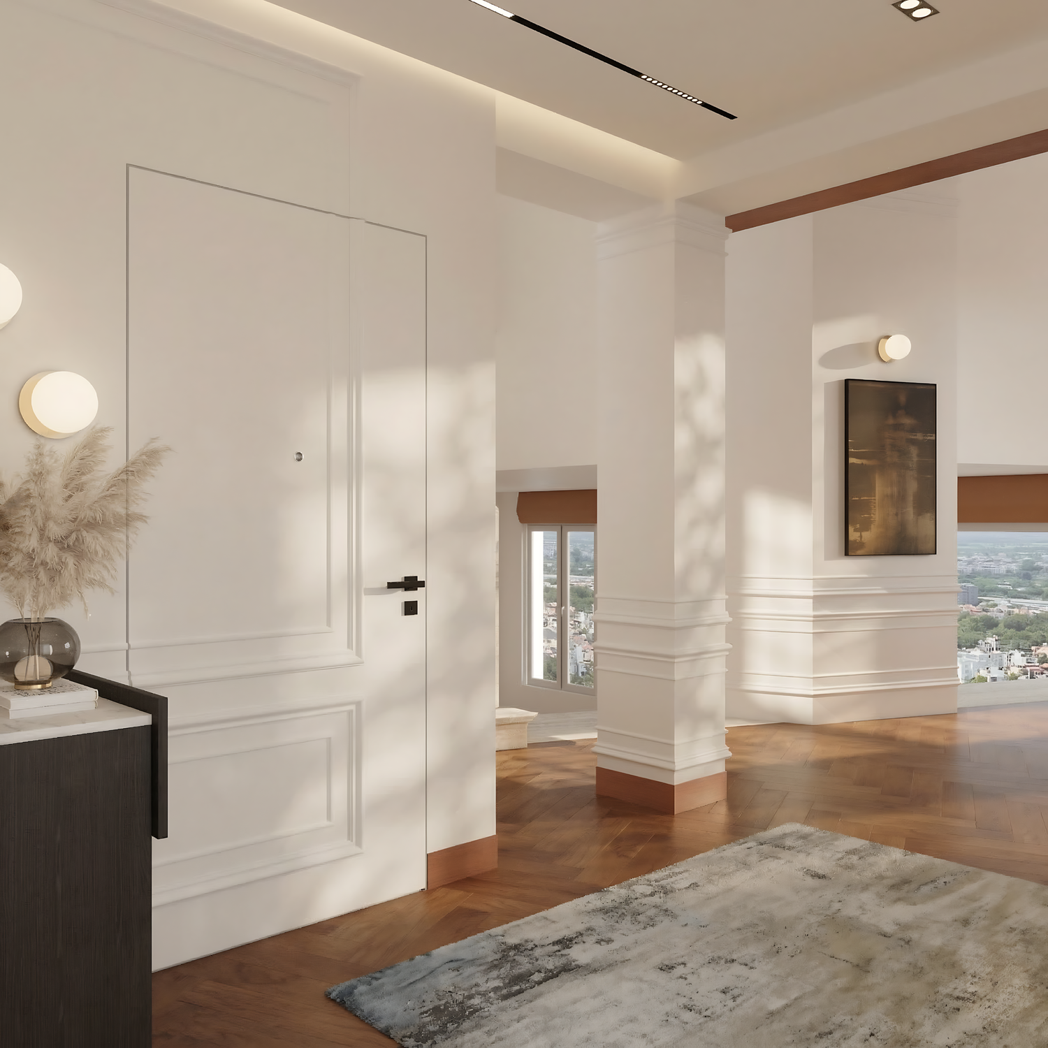 Sulle pareti sono stati inseriti pannelli boiserie, integrando visivamente la porta d’ingresso e la porta del locale di servizio, che risultano così parte della stessa superficie muraria, per un effetto più pulito e coerente.